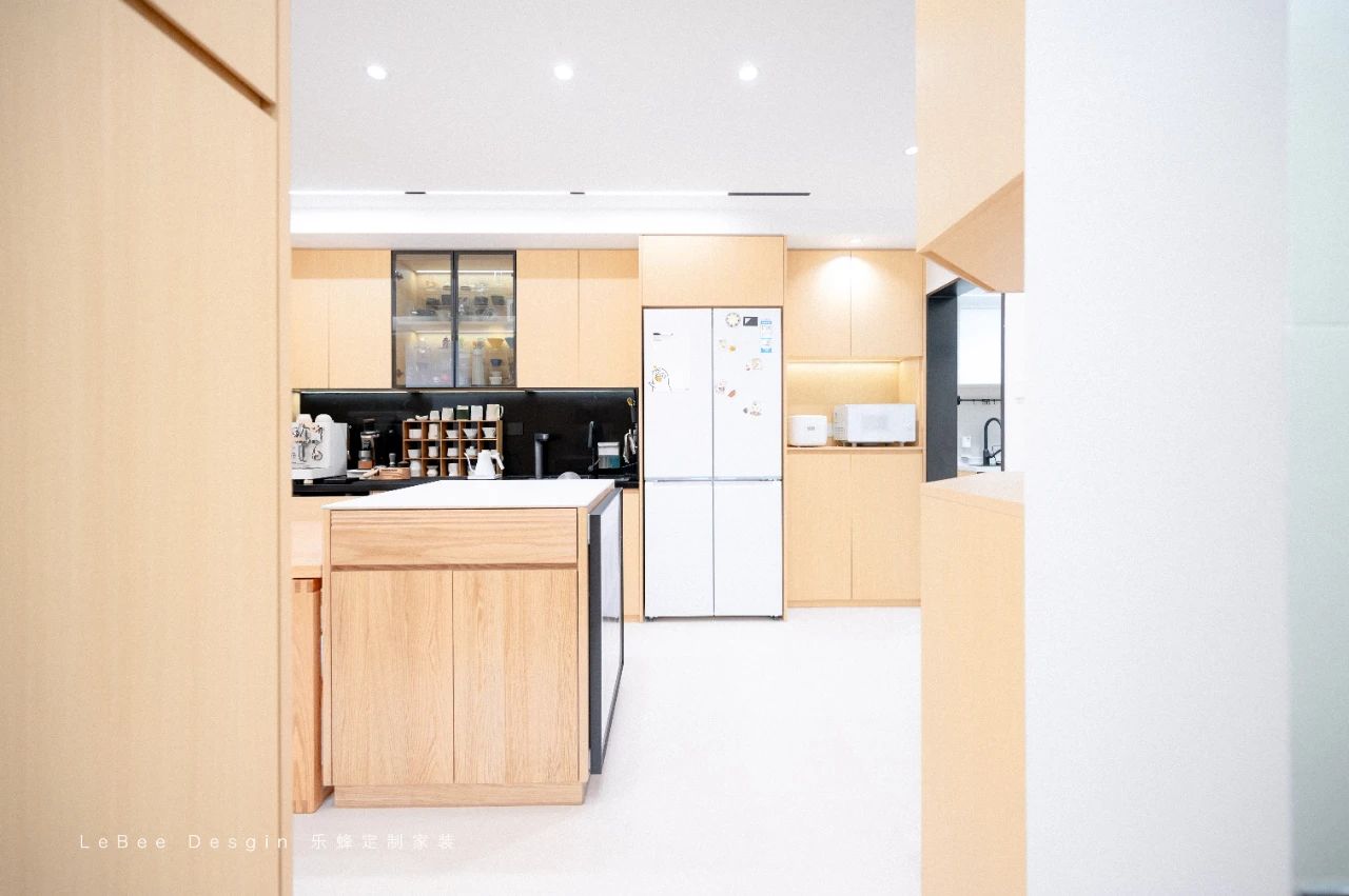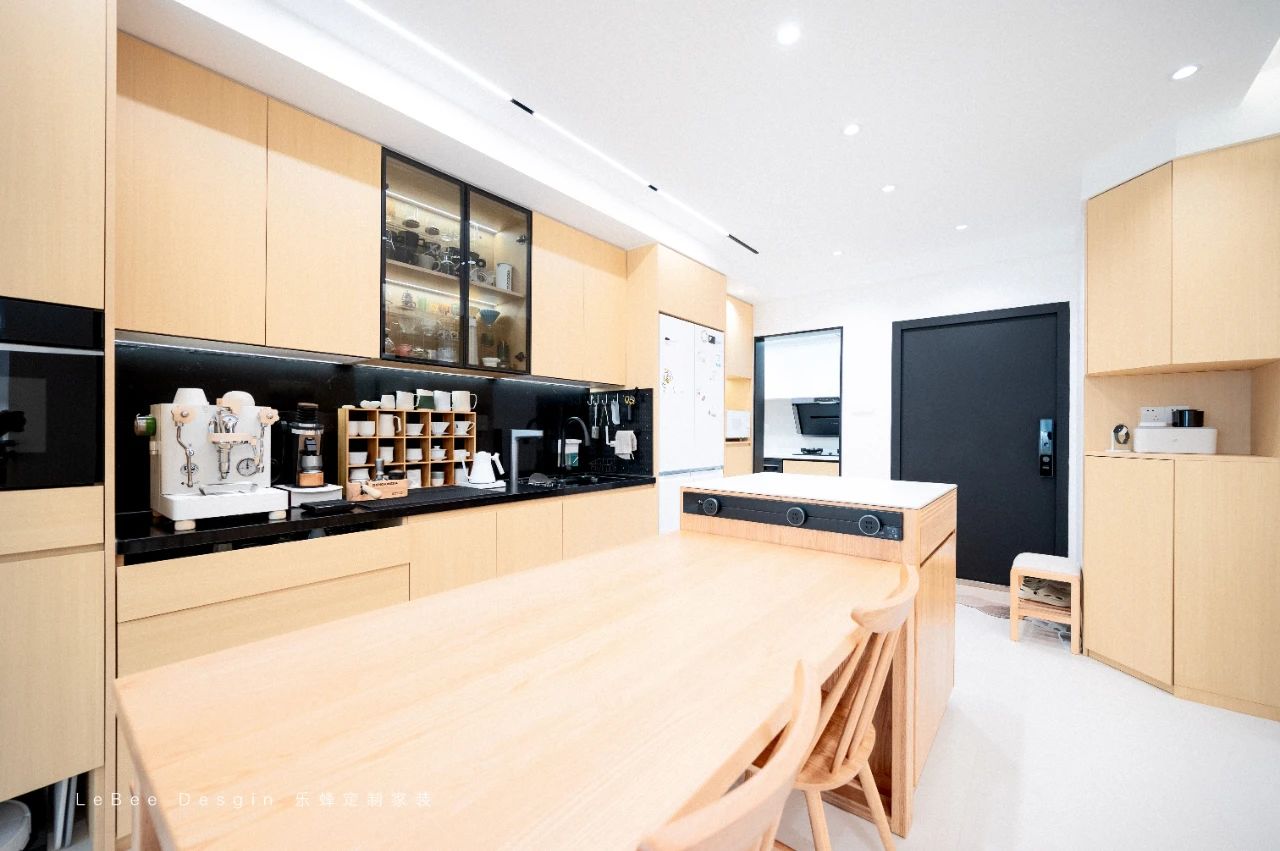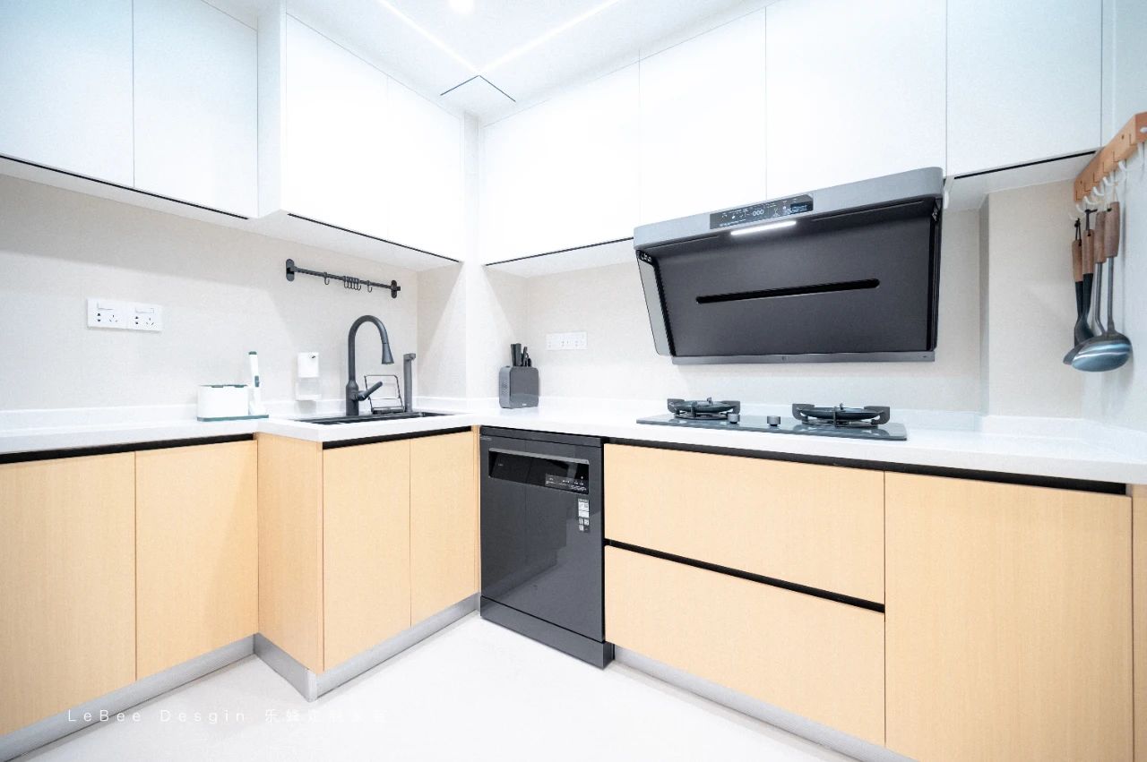 廚房是 L 型布局,它整體運用了原木與米白色上下拼的設計,這種搭配讓整個空間瞬間充滿溫馨的氣息。