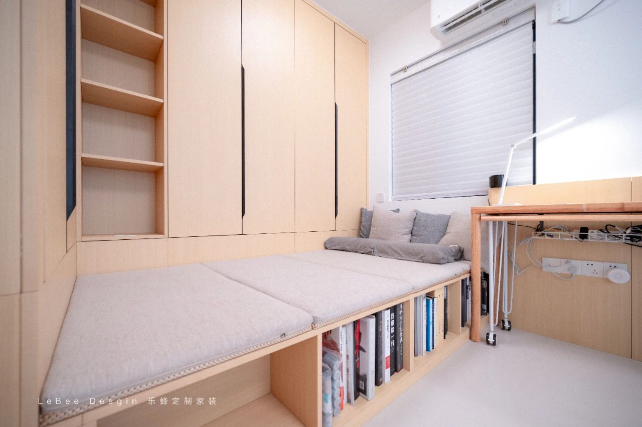 半墻木飾面+白色乳膠漆,更是增添了一份自然的韻味。而且還巧妙地設計了一個兼顧收納的閱讀區,在這里閱讀、放松,簡直太愜意了。
