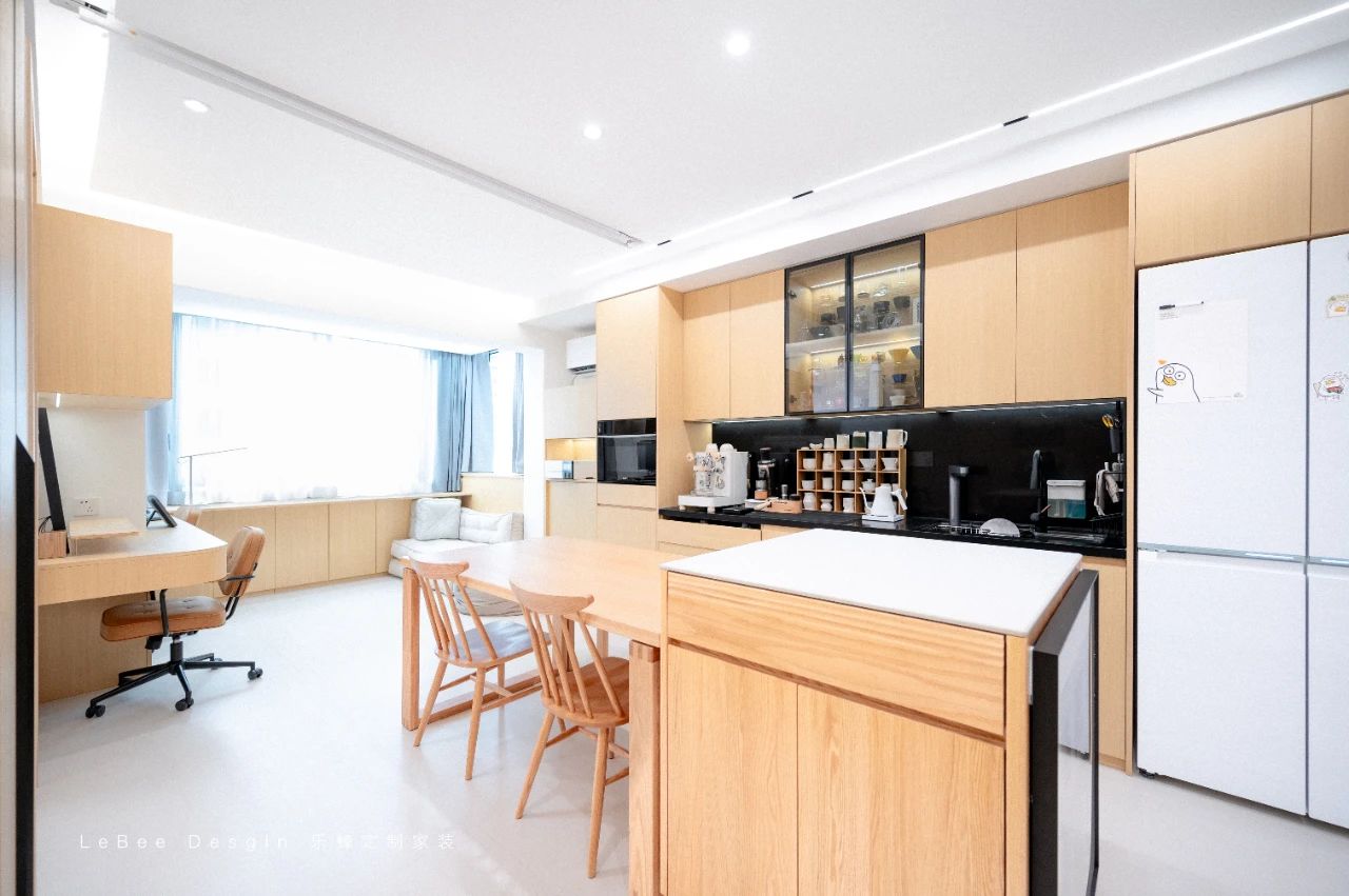 本案為兩夫妻專屬設計,原木風盡顯溫馨。整體設計重收納,原木柜門與奶油風融合,氛圍溫暖清新。