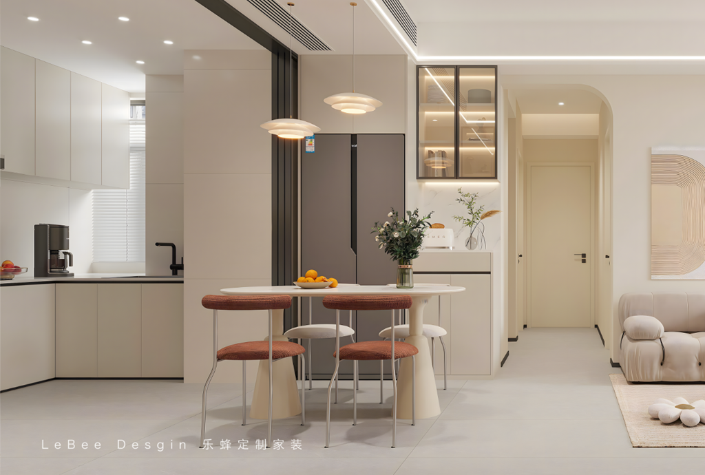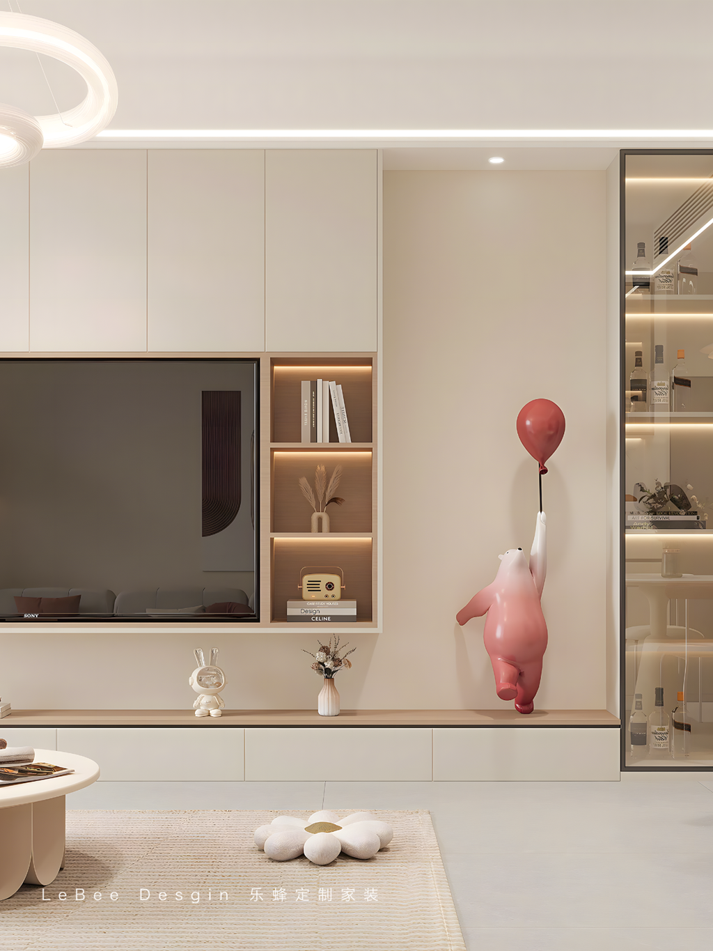 在深圳羅湖的翠園華府,有一處被奶油風裝修包裹的溫馨之所,屬于一對 90 后的年輕夫妻。他們身旁伴著一個俏皮可愛的小女孩,女主人鐘情于奶油風,追求簡潔之美,于是簡約奶油風成為了他們的不二之選。 同時也考慮到男主人對動漫小擺件和手辦的喜愛,專門定制了一整排的展示柜,滿滿都是關懷與愛意。