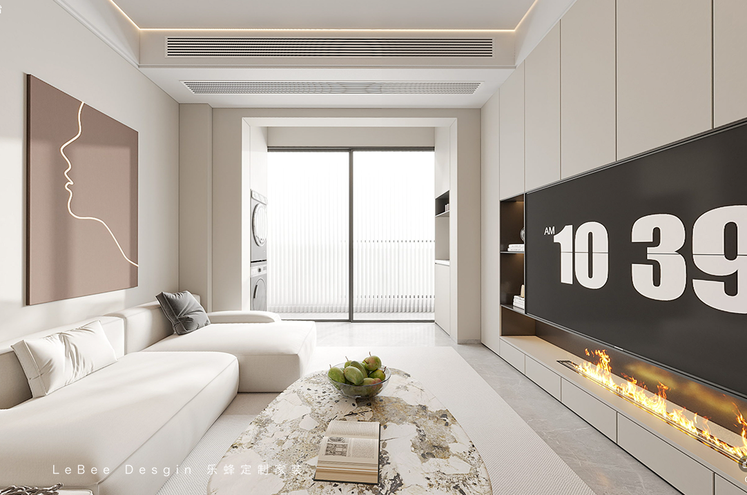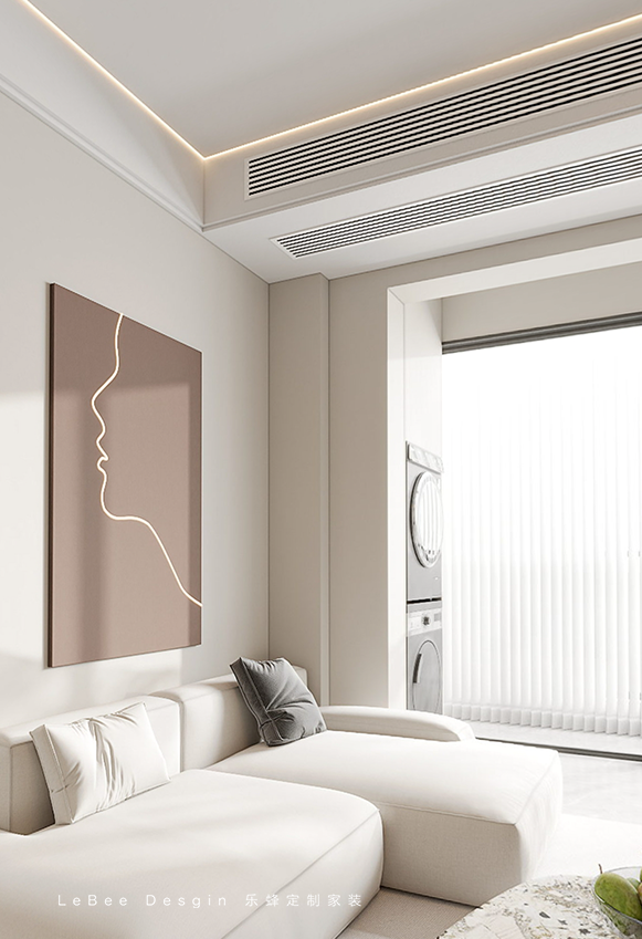 封窗處理后的陽臺,與客廳完美融合,視野更加開闊。從客廳連接到陽臺的那一排柜子,不僅提供了充足的收納空間,還讓整個區域更加整潔有序。而陽臺內嵌的洗烘一體洗衣機,更是將功能性發揮到極致,節省空間的同時,讓洗衣變得輕松便捷。