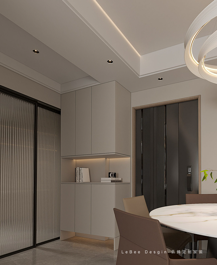 入戶左手邊打造了一門到頂的玄關柜,中間和下方采用鏤空設計,均安裝了嵌入式感應燈,不僅增加了柜子的儲物空間,還使其看起來更加輕盈高級。