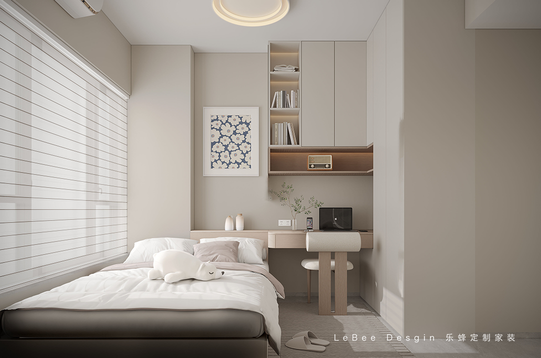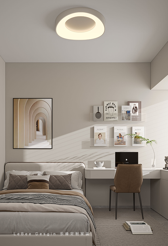 臥整體淺色系為主,考慮到方便實用,我們利用窗戶轉角打造一個視野采光超贊的懸浮書桌,底部也打造了無拉手米白色柜子,方便收納。簡單的吊燈和壁畫也為空間添加了一絲溫馨。