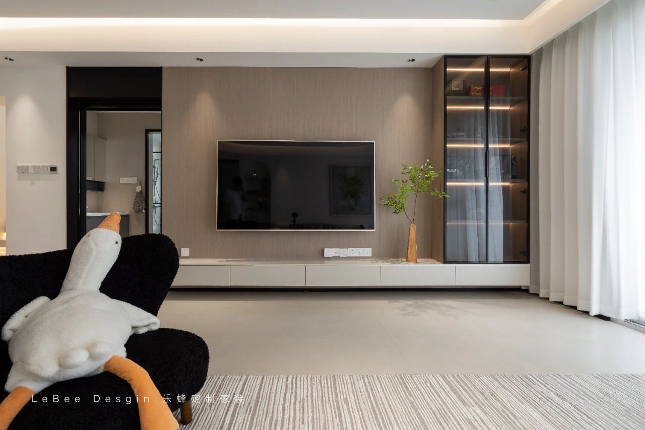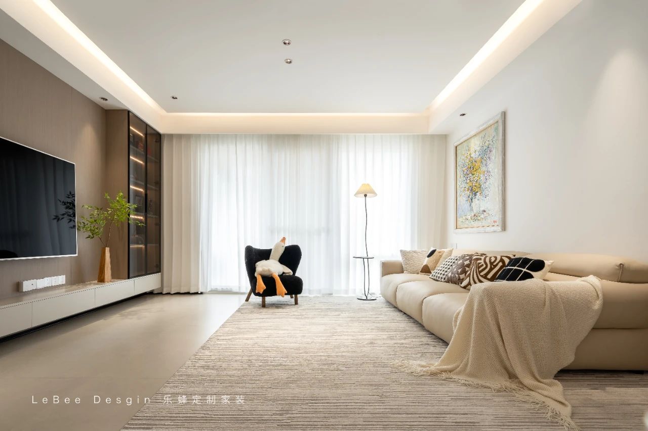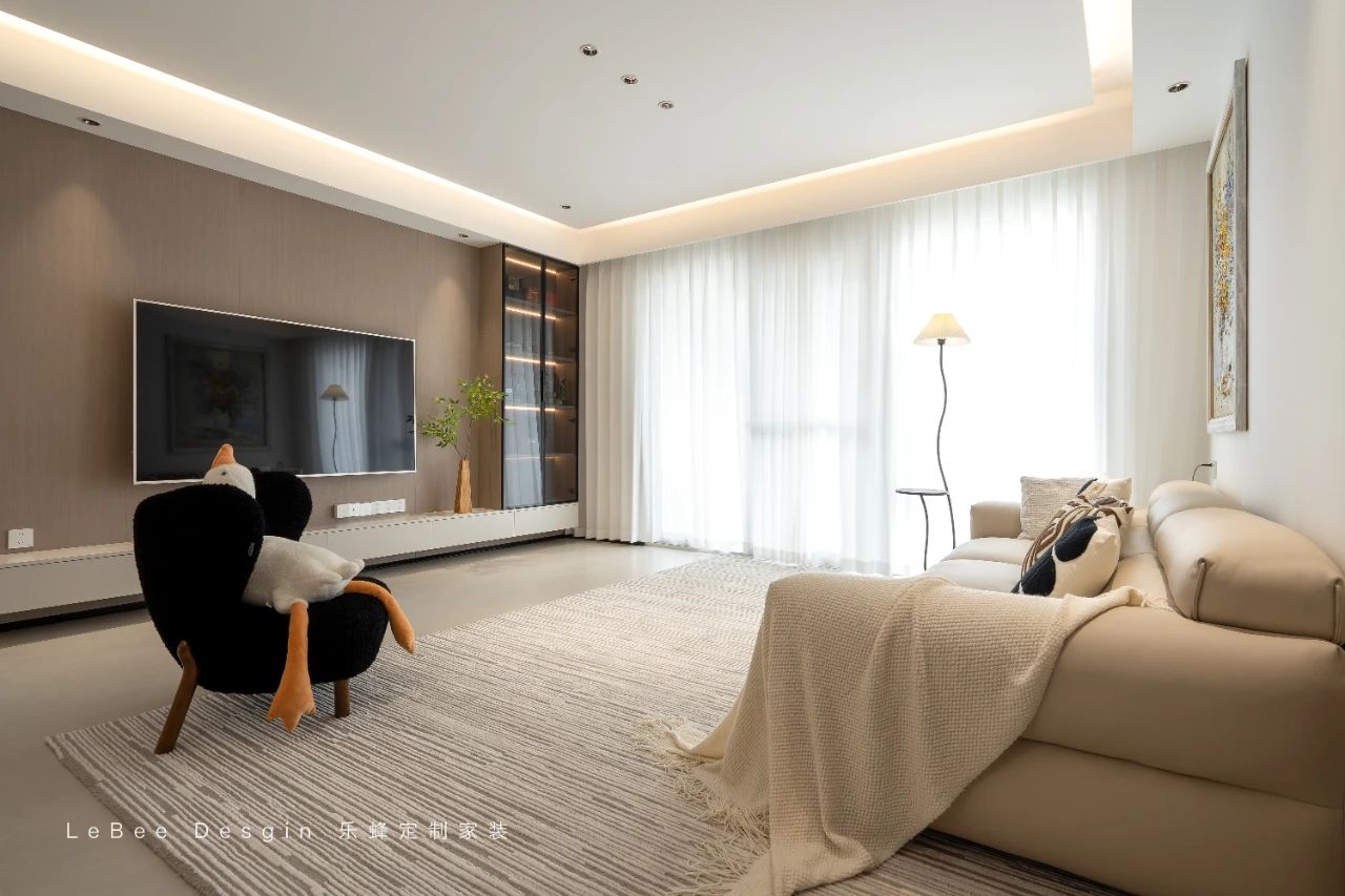 客廳空間沉浸在溫暖的色調之中。電視背景墻采用獨具匠心的懸浮式構造,下方精心嵌入的燈帶將溫馨氛圍渲染得淋漓盡致。