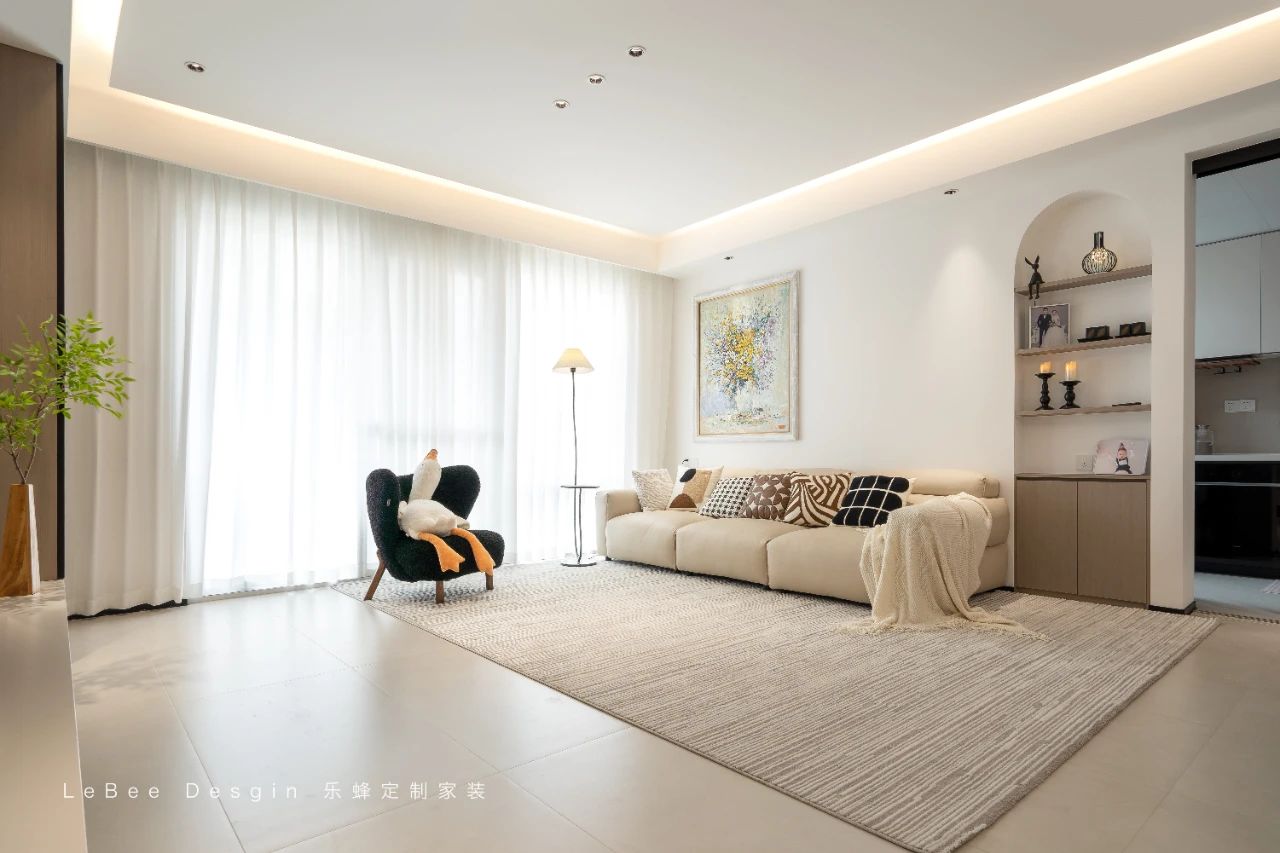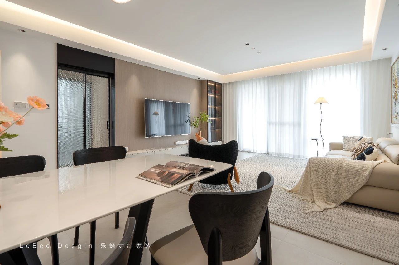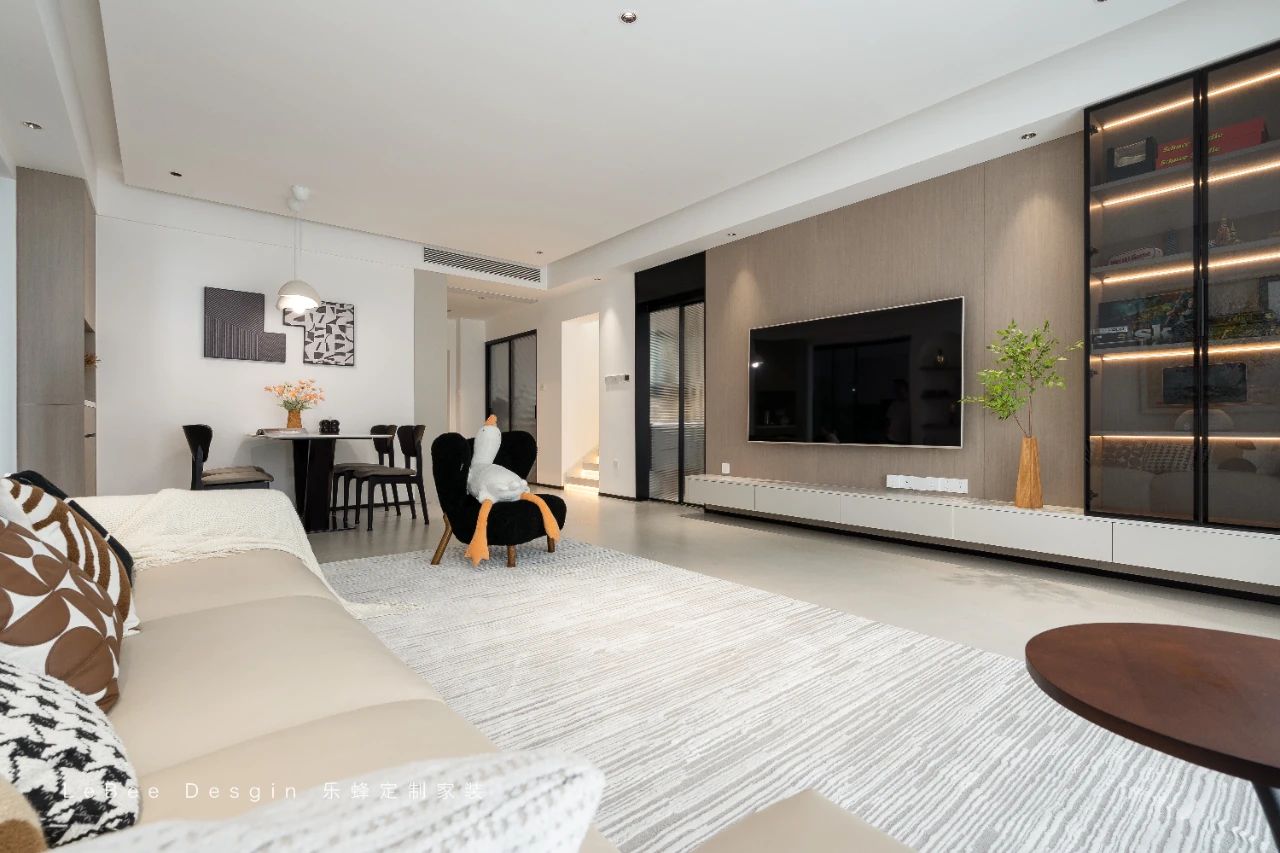 客廳空間沉浸在溫暖的色調之中。電視背景墻采用獨具匠心的懸浮式構造,下方精心嵌入的燈帶將溫馨氛圍渲染得淋漓盡致。