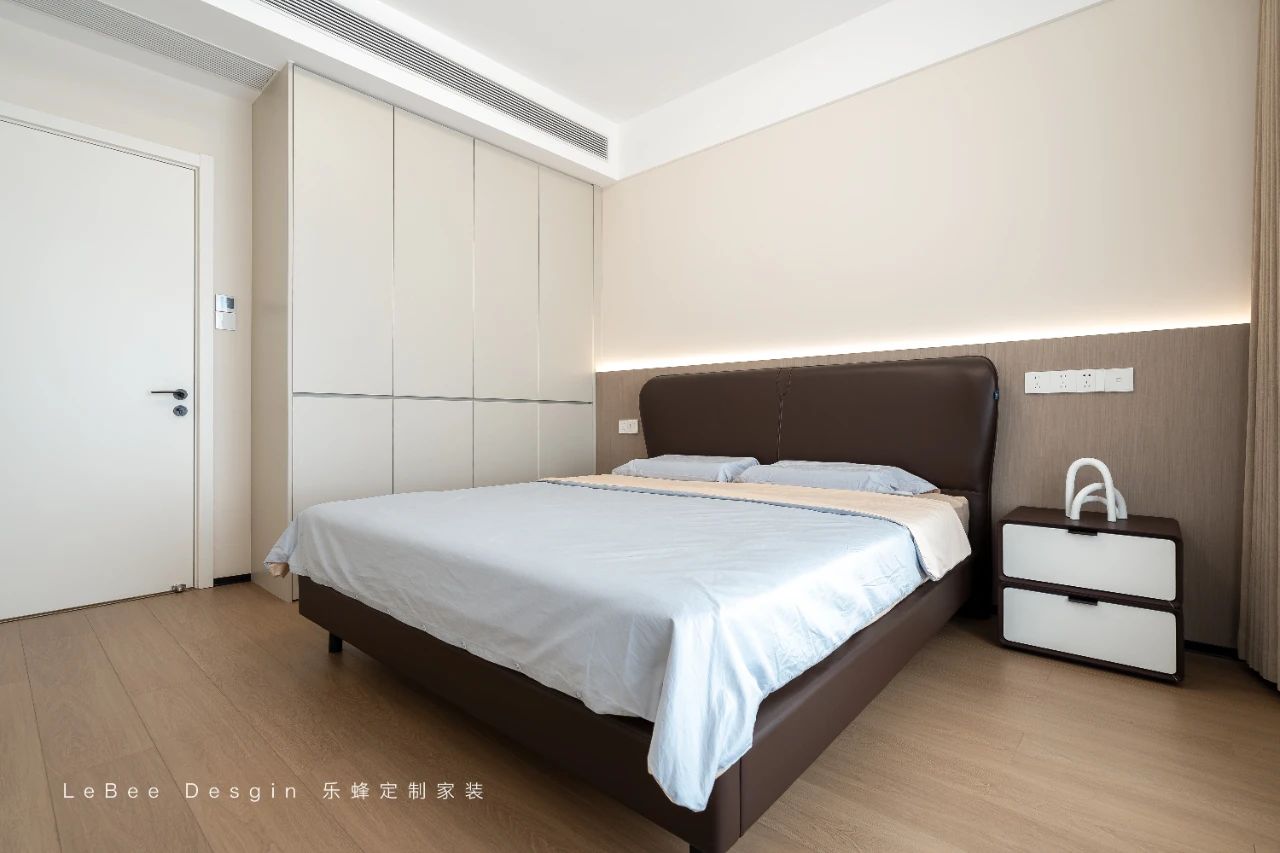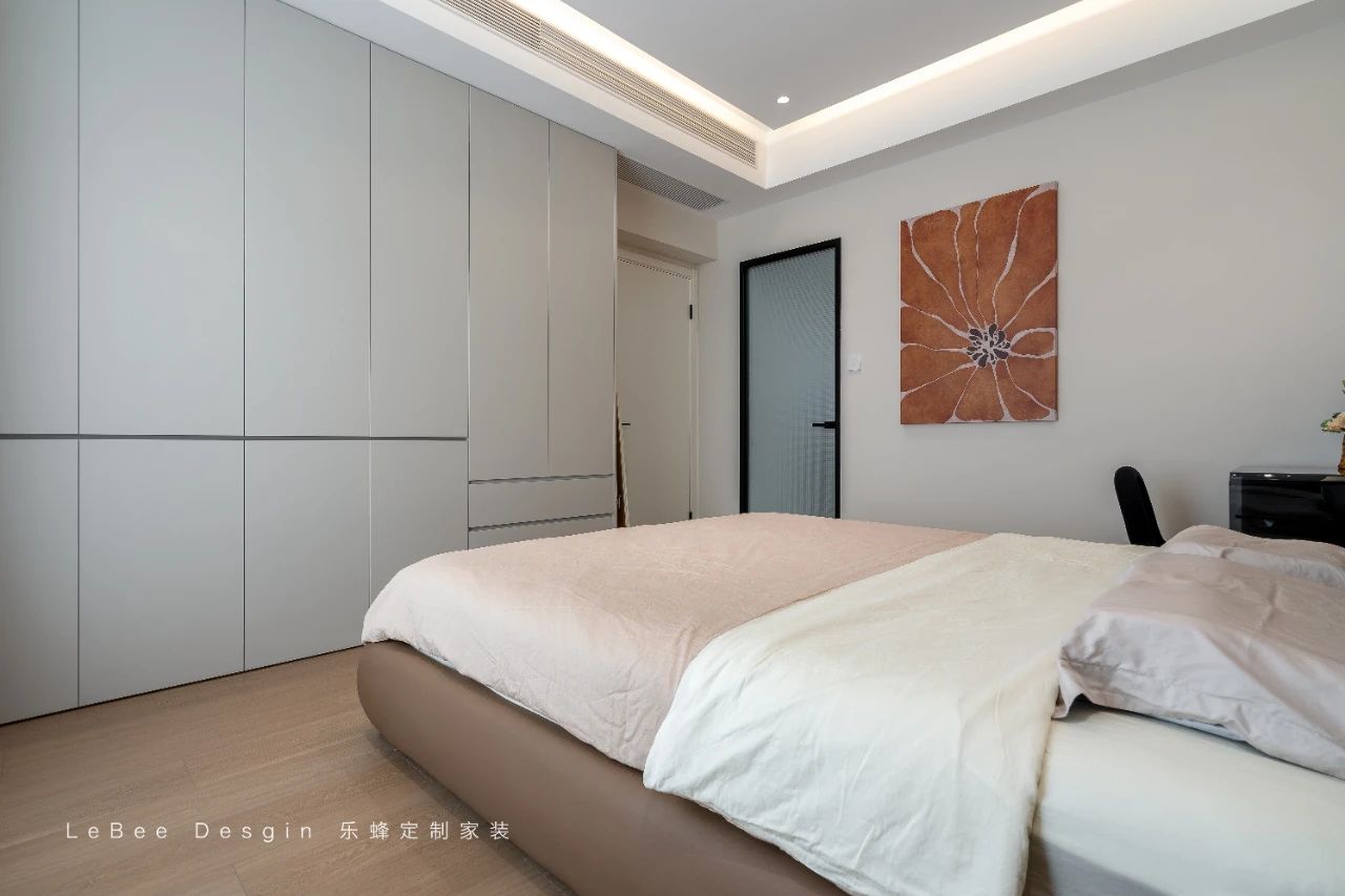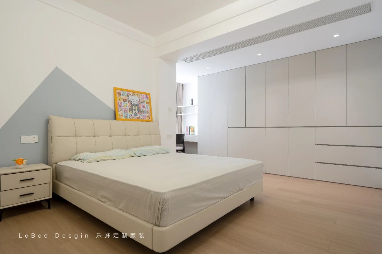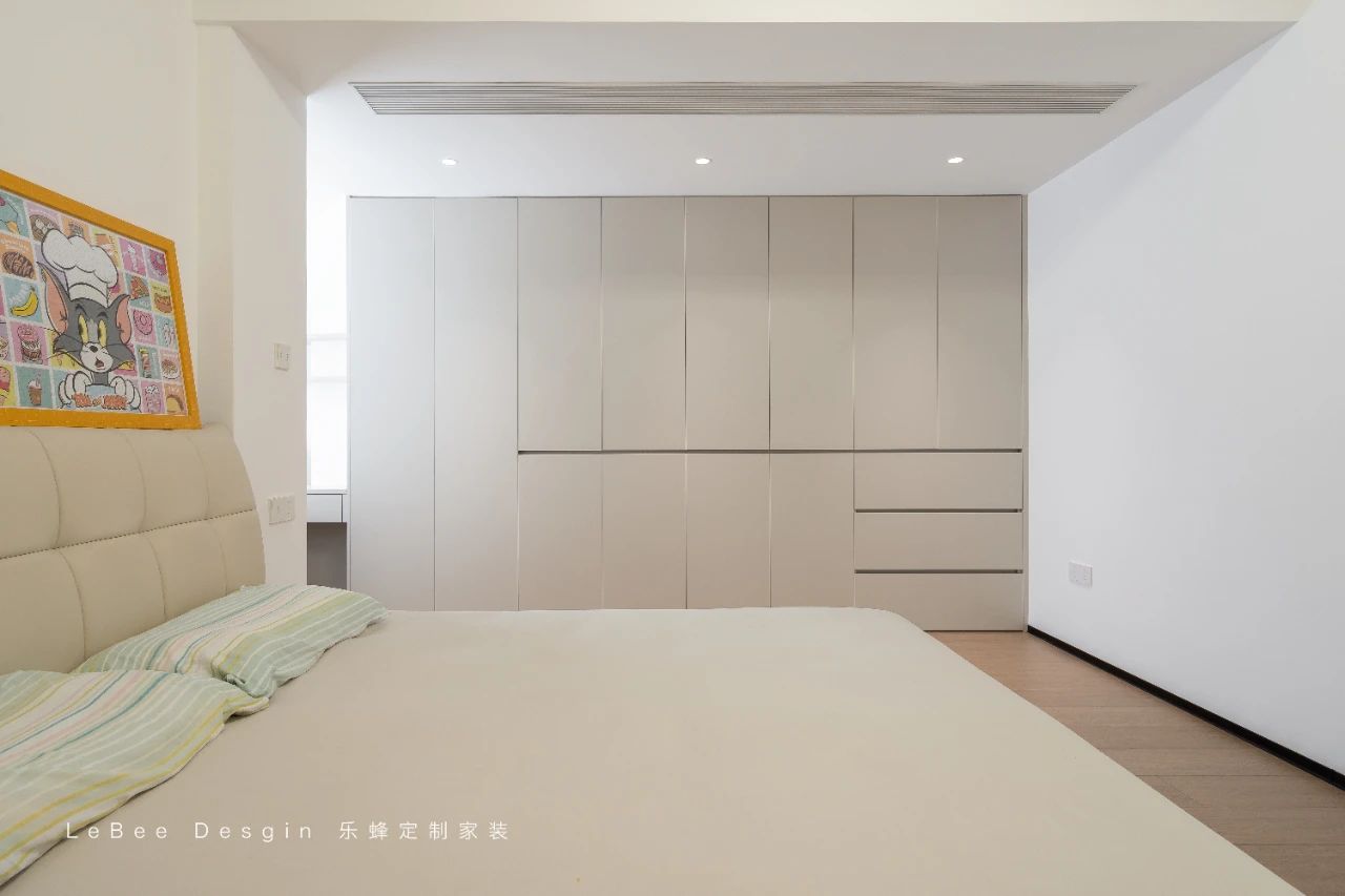 床尾擺放著米白色的一門到頂定制柜,簡約大氣又極具實用性。一旁還精心設置了一個可充當床頭柜的梳妝臺,其精致的設計與整體風格相得益彰。