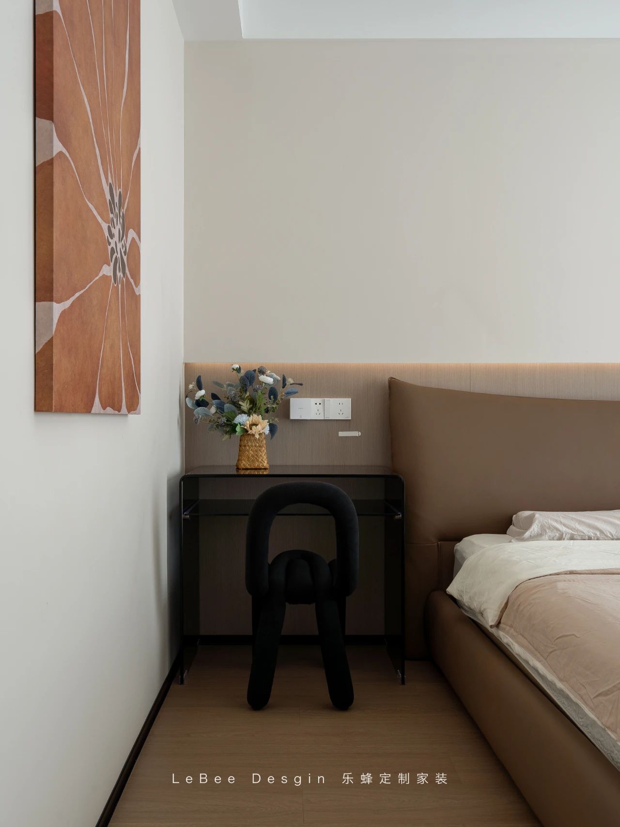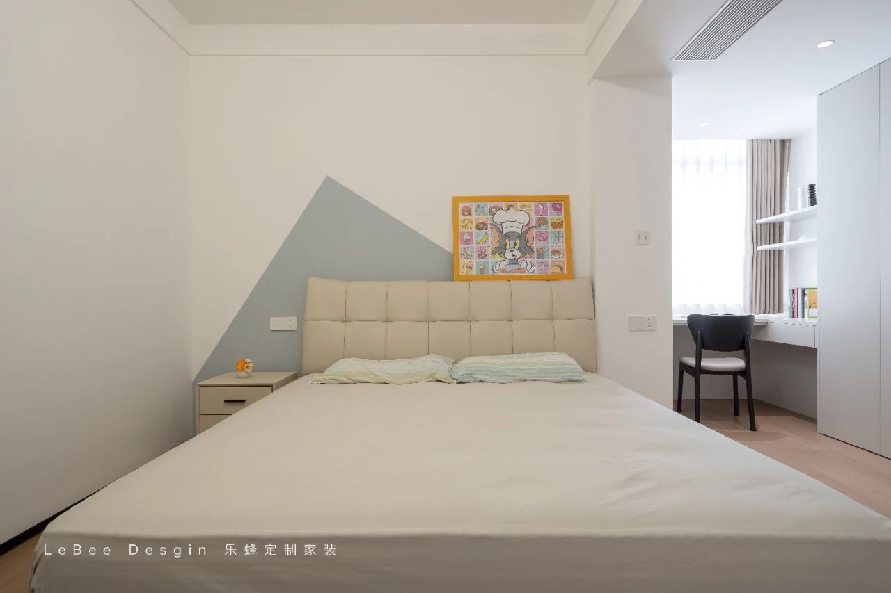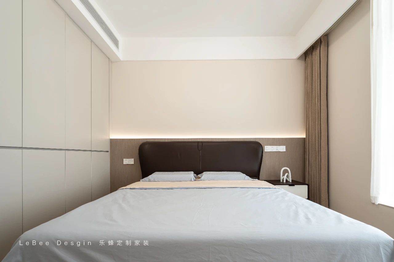 床尾擺放著米白色的一門到頂定制柜,簡約大氣又極具實用性。一旁還精心設置了一個可充當床頭柜的梳妝臺,其精致的設計與整體風格相得益彰。