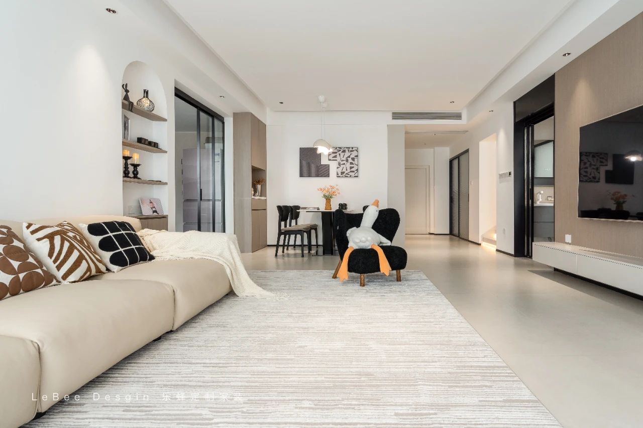 無主燈設計的運用進一步提升了空間的通透感。客餐廳鋪滿大理石地磚,搭配灰色地毯,層次感分明,于簡約質感中不失精致韻味。