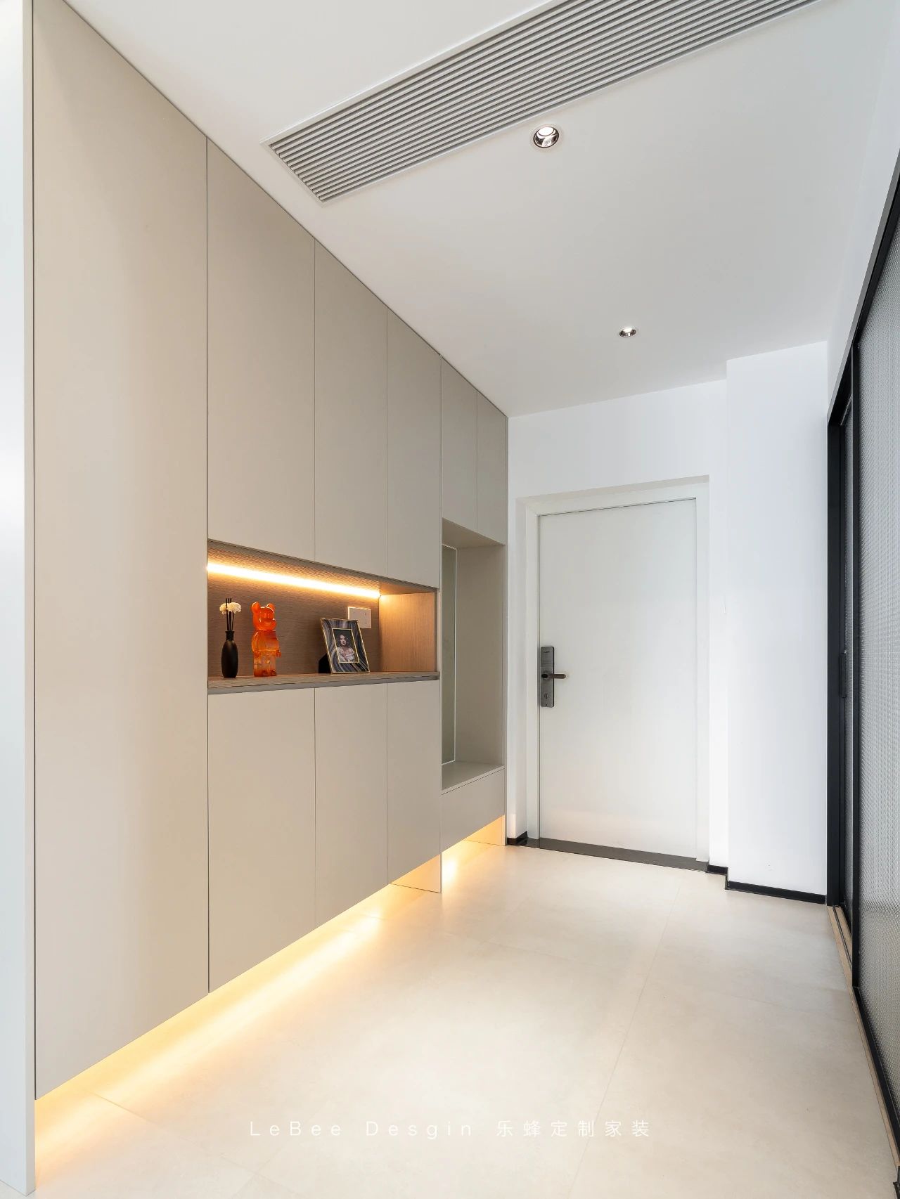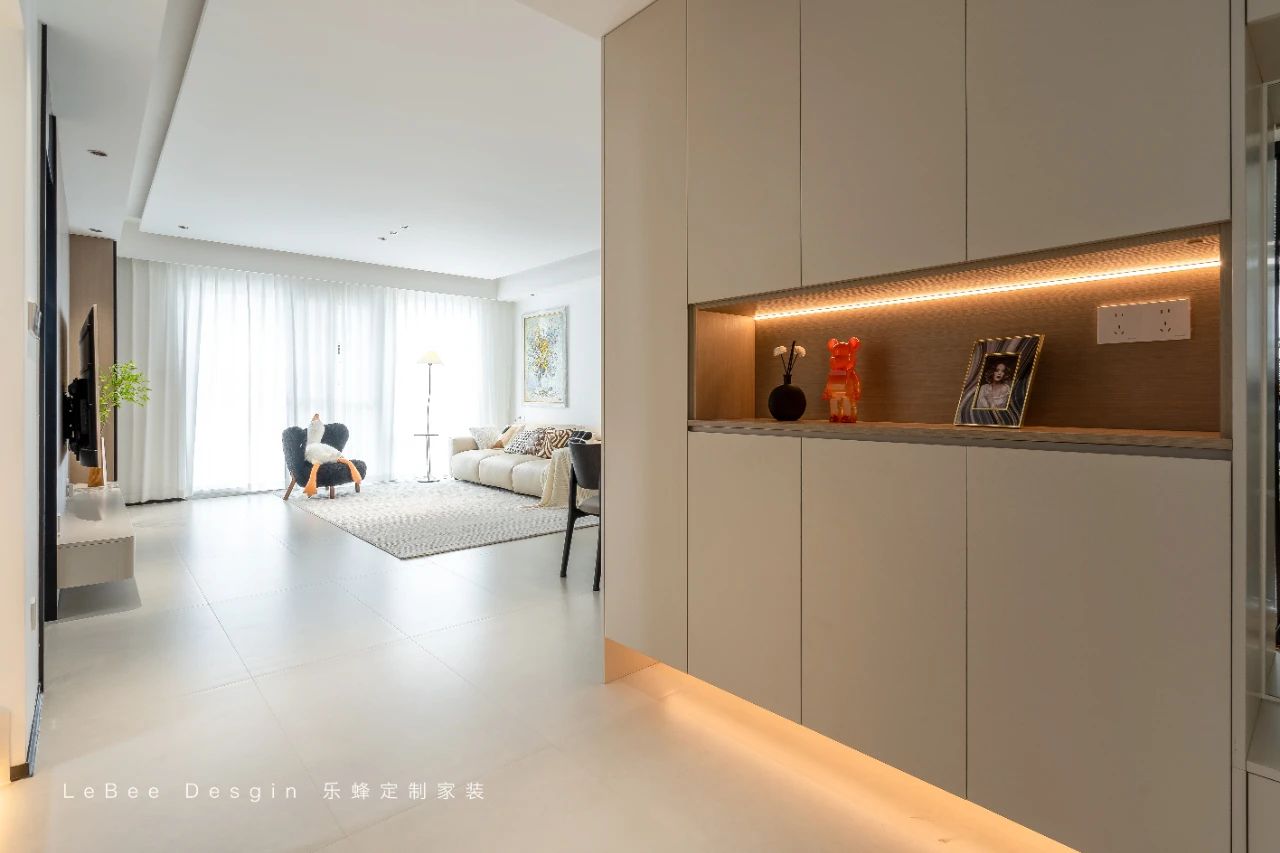 入戶打造一門到頂的奶咖色收納柜,臨近門的位置巧妙隔斷出懸浮式換鞋凳,其底部預留出充足空間,用于放置日常頻繁穿著的鞋子。