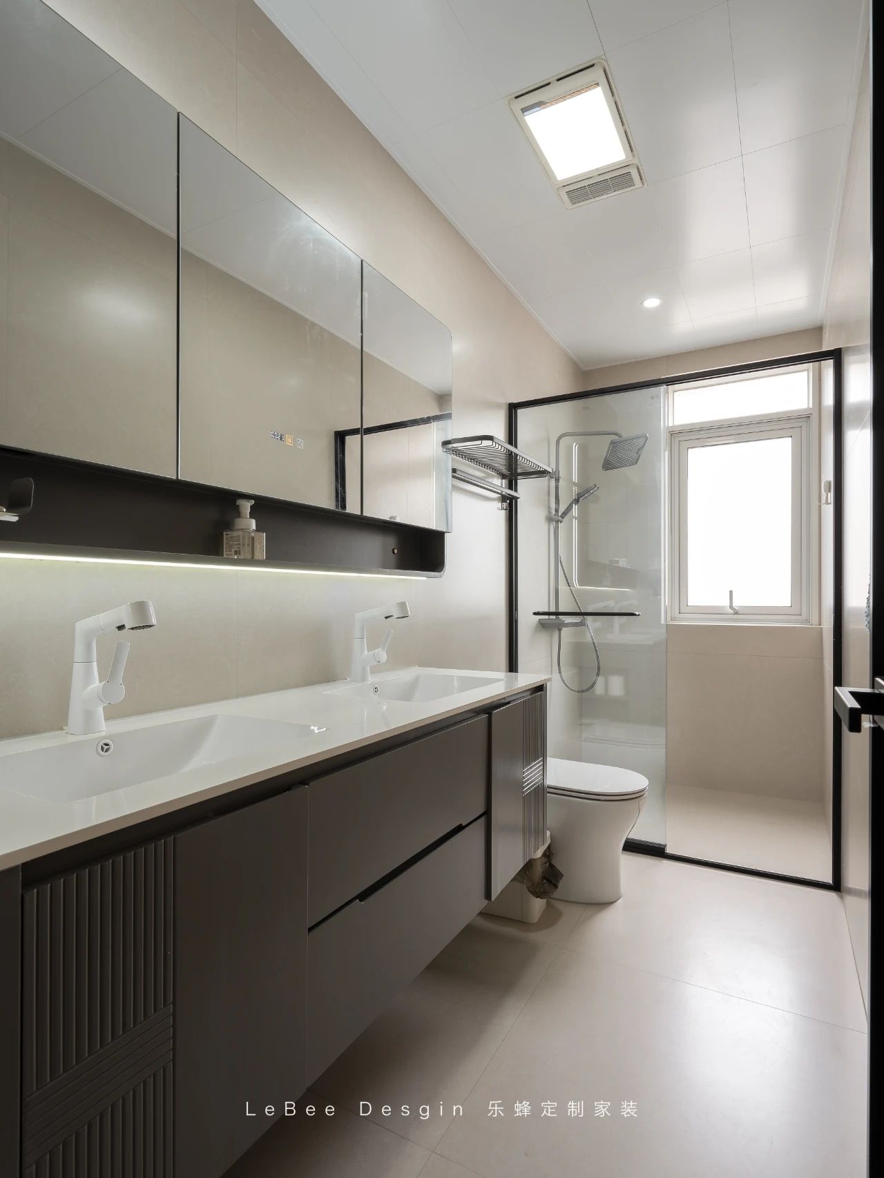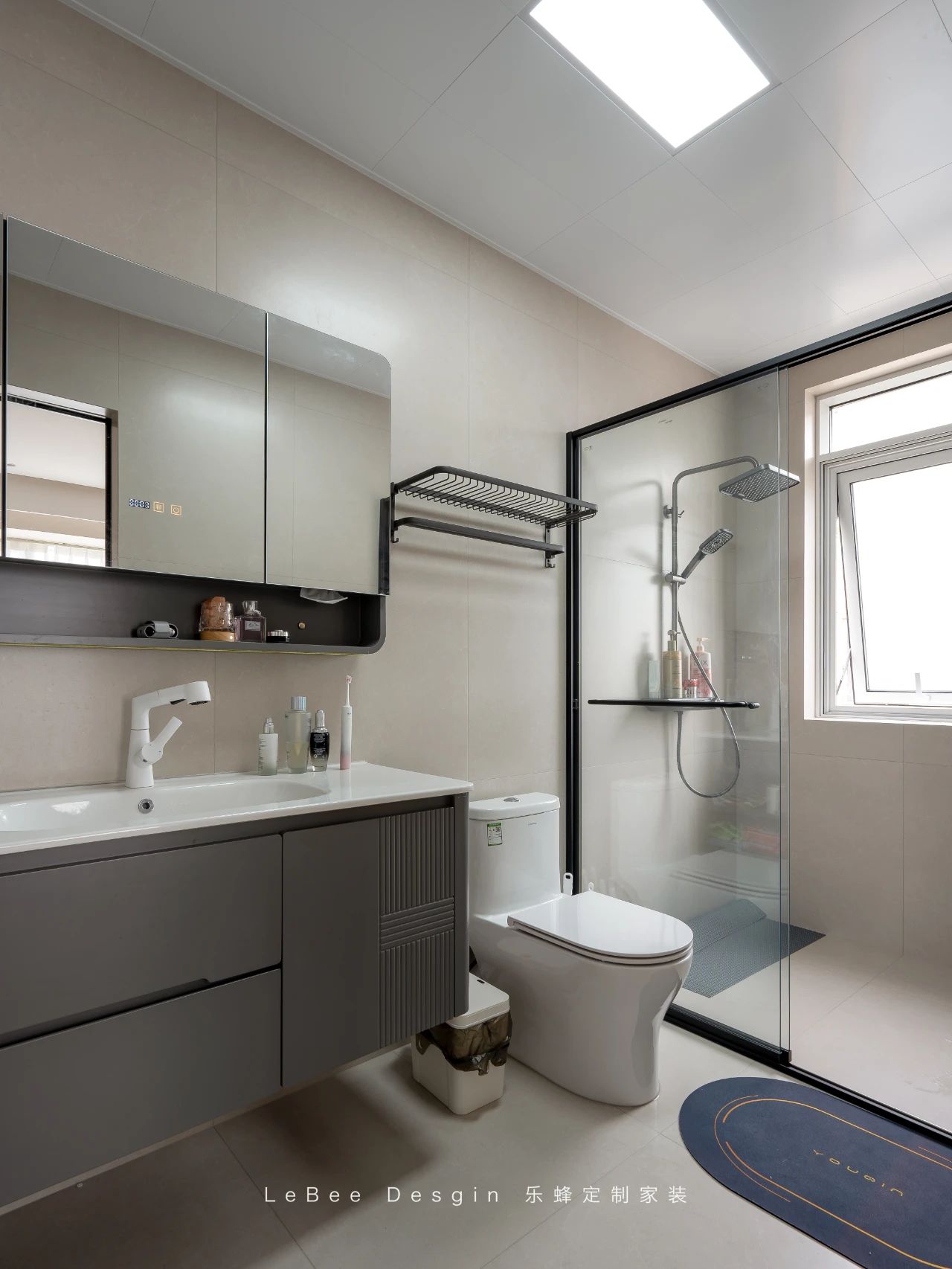 色彩以白為主,配灰色,材質用防水瓷磚和木材。照明燈帶與吸頂燈結合,通風設備佳。實現功能分離,簡約舒適,帶來愉悅衛浴體驗。