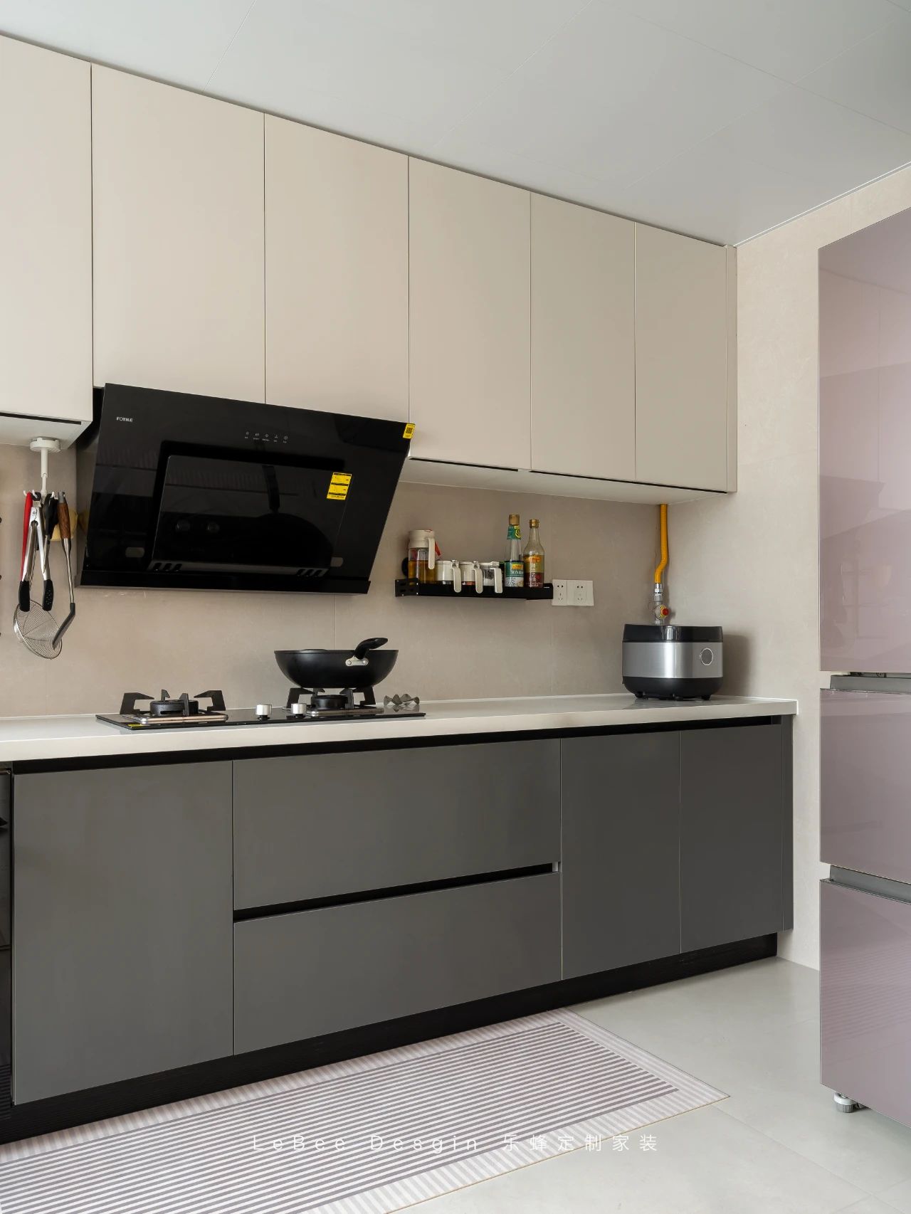 廚房內部采用白色吊柜櫥柜,深藍色地柜內嵌洗碗機,無拉手的設計,操作臺上擺放著各類精致廚具,充滿生活韻味。