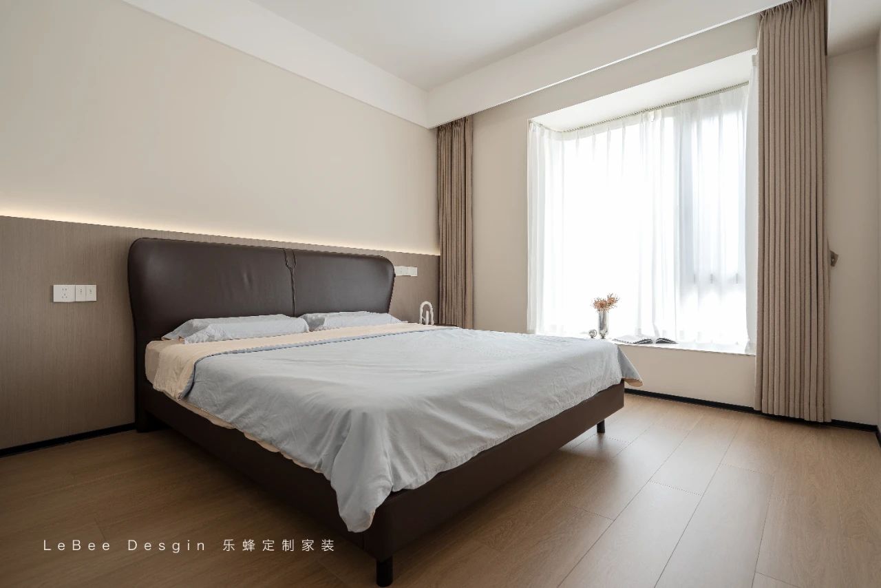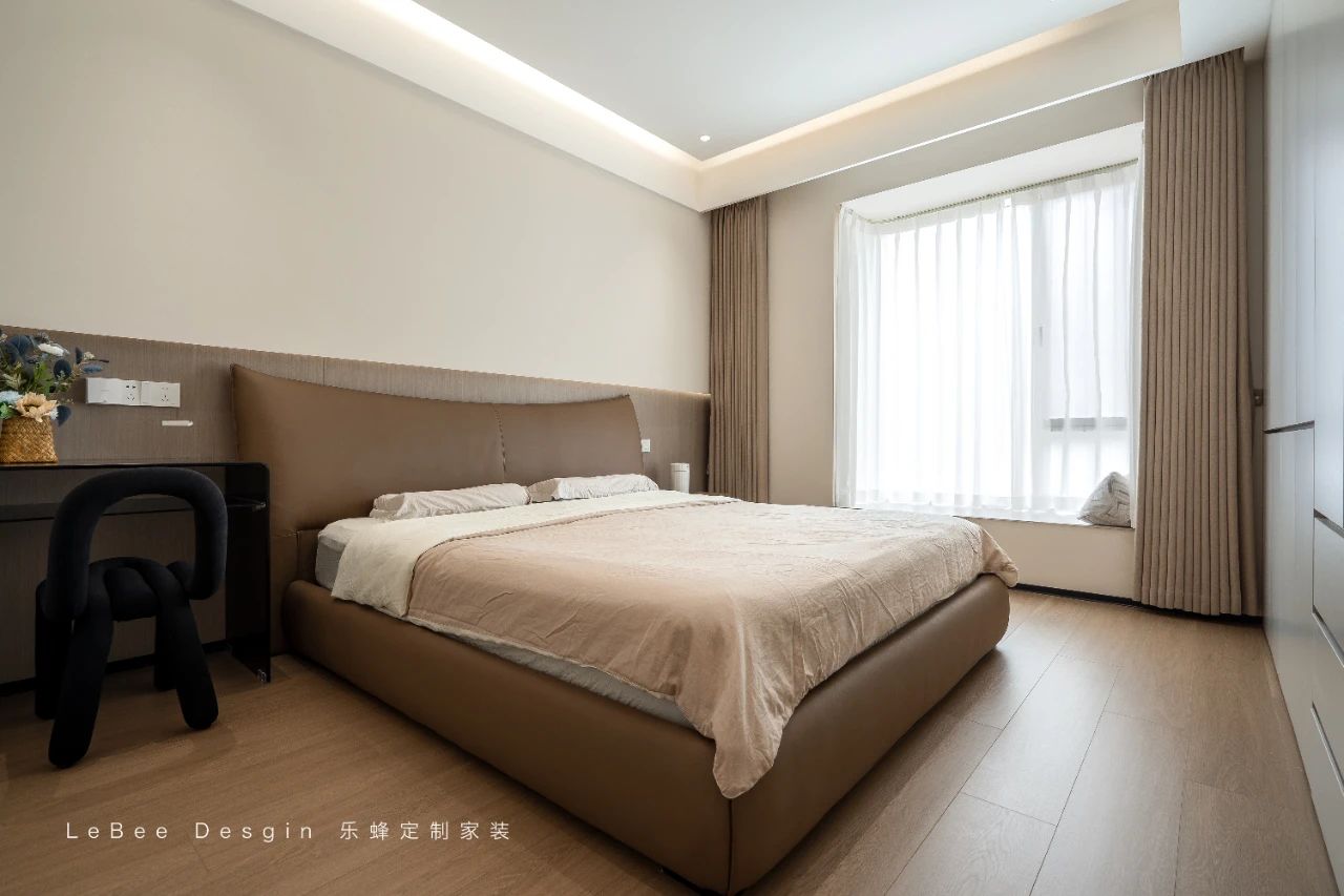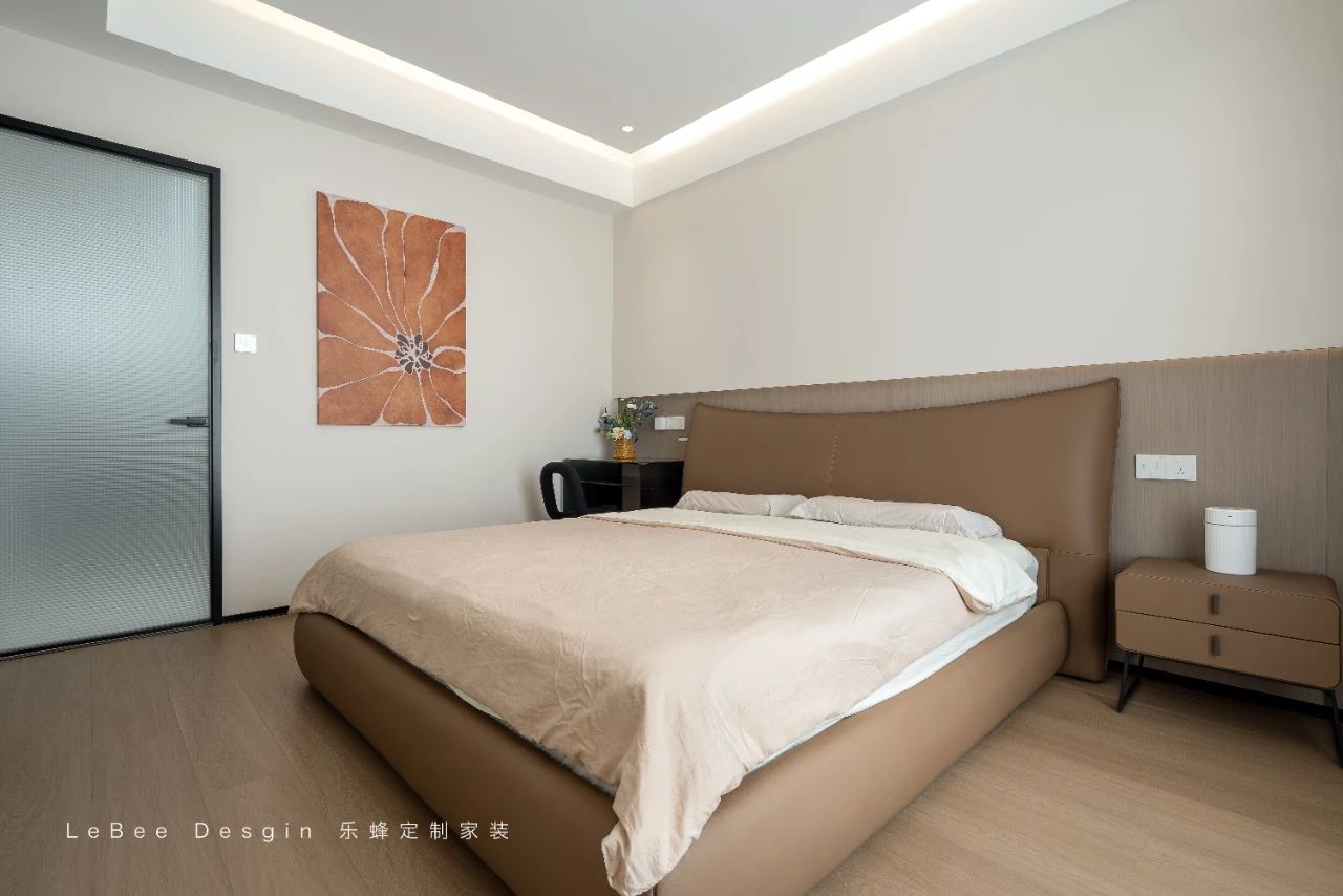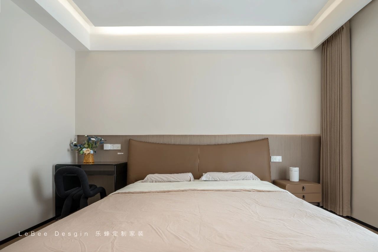 懸浮式的吊頂造型獨特,其中內嵌著柔和的燈帶,當燈光亮起,溫暖的光線均勻地灑落在房間的每一個角落,讓整個主臥空間沉浸在溫馨舒適的氛圍之中。