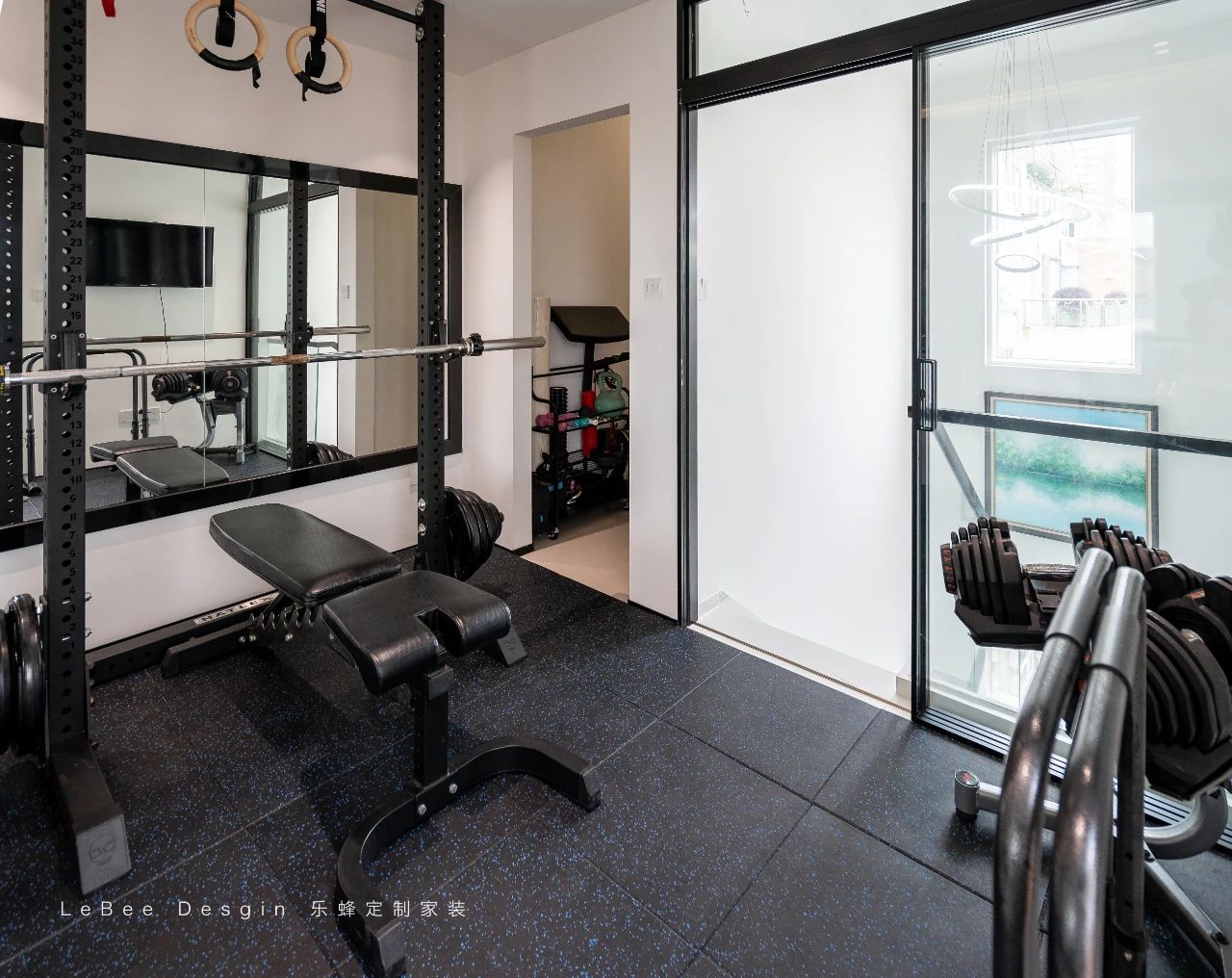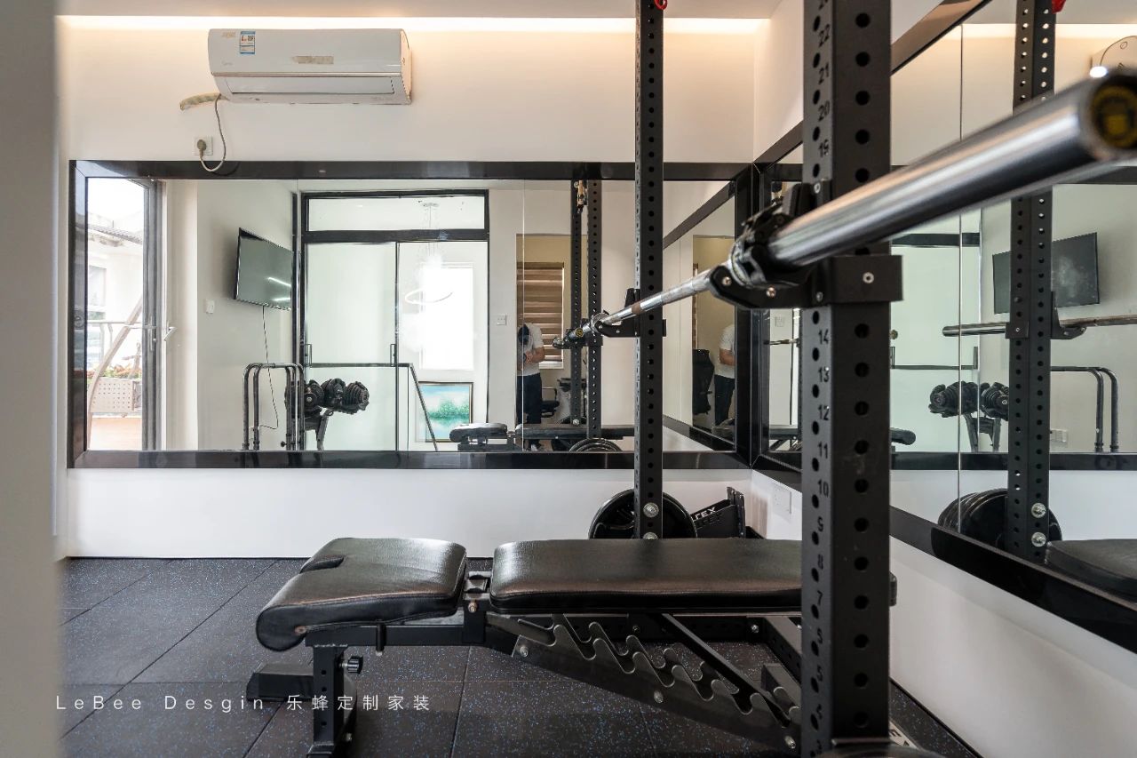 三樓則打造一個小健身房。這個健身房空間雖然不大,但布局合理且設施齊全。入門處擺放著一排嶄新的啞鈴,從小到大依次排列,閃耀著金屬的光澤。
