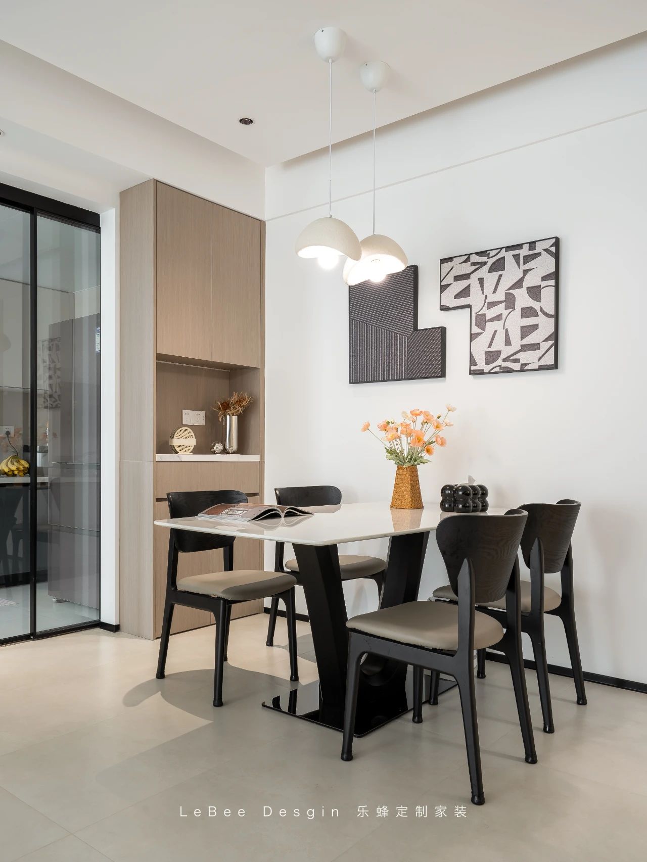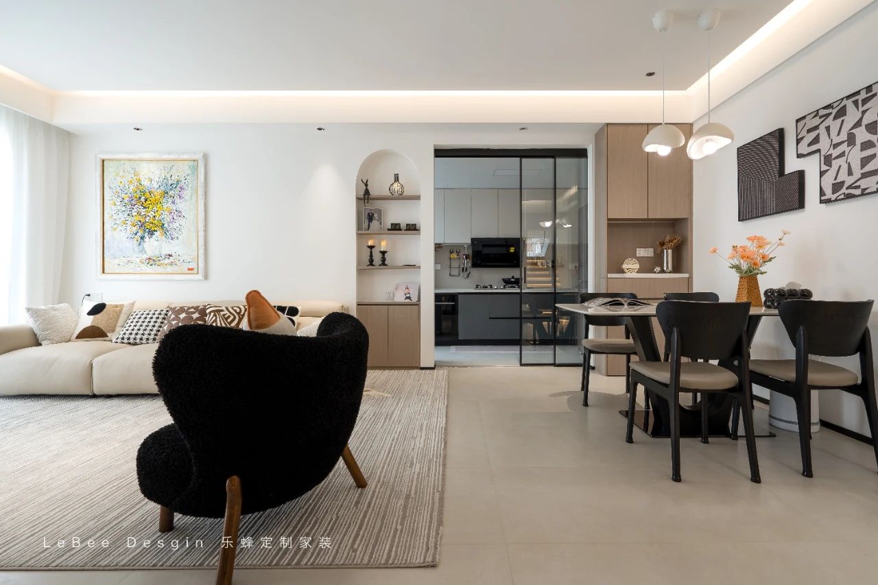 半開放式的廚房與客餐廳緊密相連,一扇透明的玻璃移門巧妙分隔。