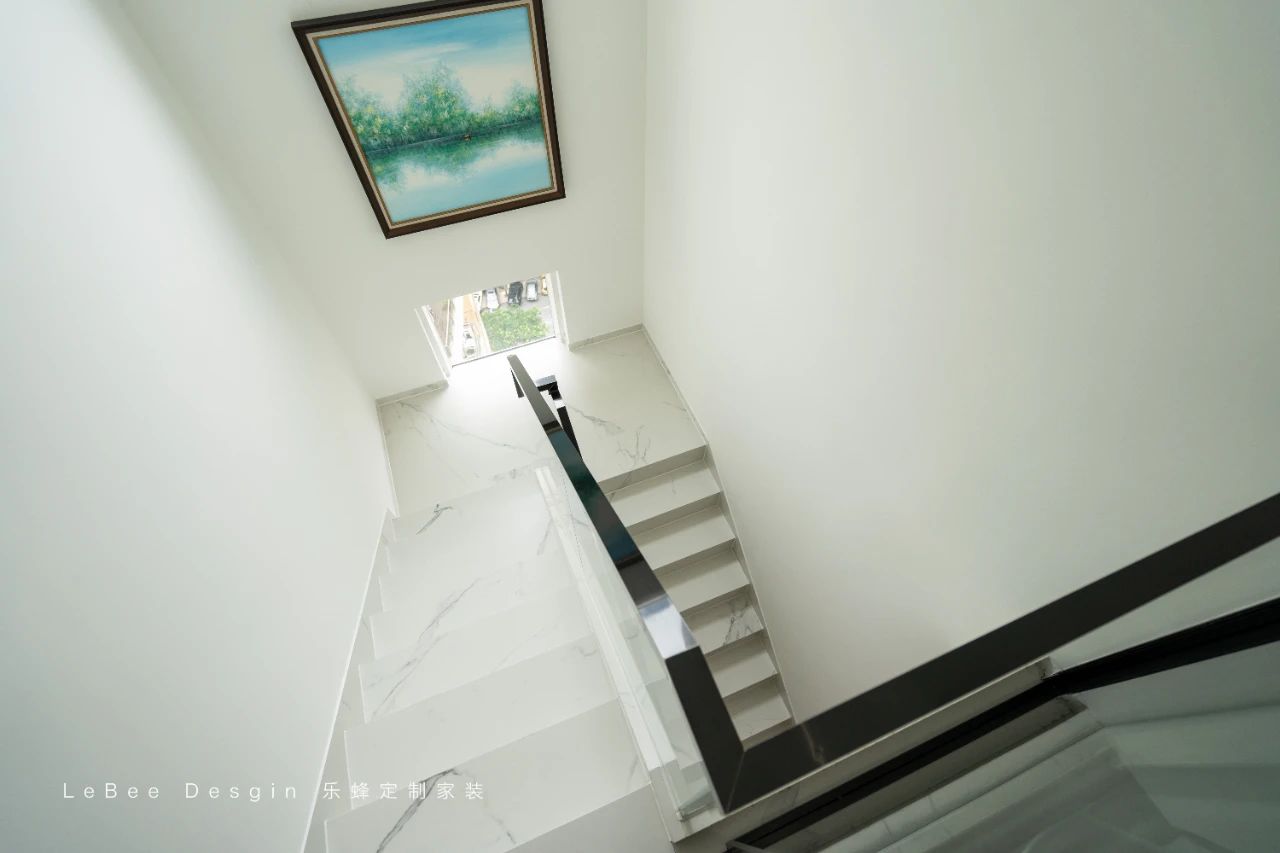 轉角處的風景畫增添清新。從樓上看,樓梯如優美曲線,串聯兩層溫馨生活。簡約風的復式樓里,樓梯仿佛優雅的藝術品。踏步由實木制成,涂著奶油色漆,寬度和高度精心設計。
