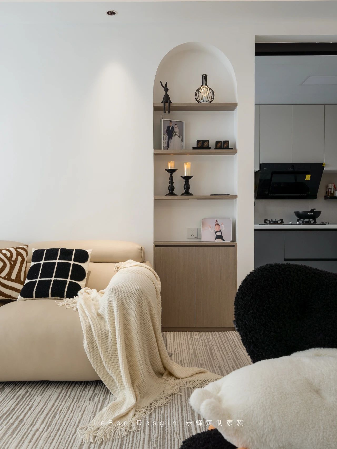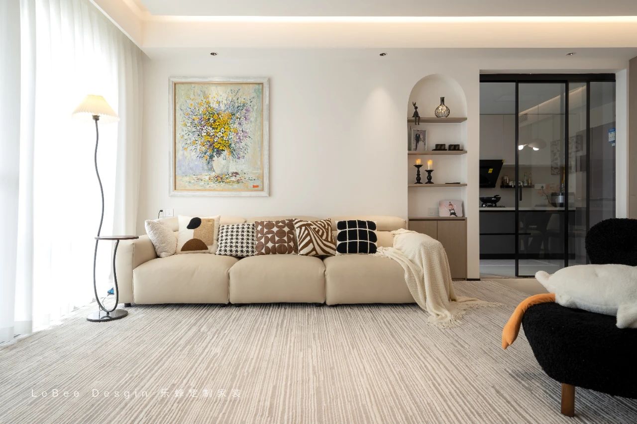 沙發背景墻面由觸感柔軟的皮質沙發、簡約而富有韻味的裝飾畫以及富有層次感的淺灰色漸變共同構成,弧形拱門開放格銜接處恰到好處地嵌入燈帶在暖咖色調的映襯下,完美彰顯出質感非凡、高級優雅的獨特格調。