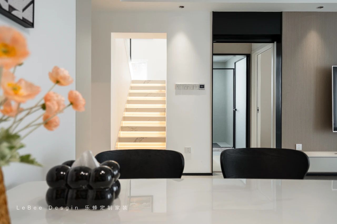 在這扶手是透明鋼化玻璃配黑色金屬邊框,時尚又通透。側墻是奶白色護墻板,有簡約線條和壁燈。