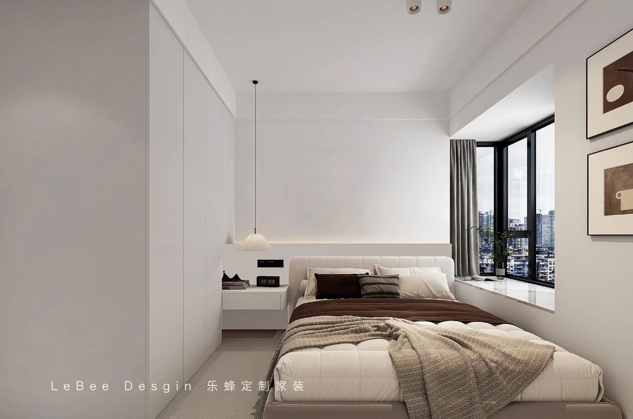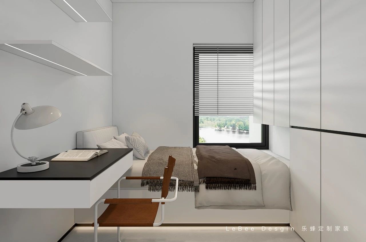 次臥用了大面積的白墻,通體純白簡單清爽,白色的紗簾將光投入,為室內(nèi)涂抹柔和的光暈,搭配燕麥色色的亮光磚,清冷感十足,房門,柜門都做了通頂?shù)碾[形門做了一個懸浮式書桌使用,平時可以用來辦公,閱讀。