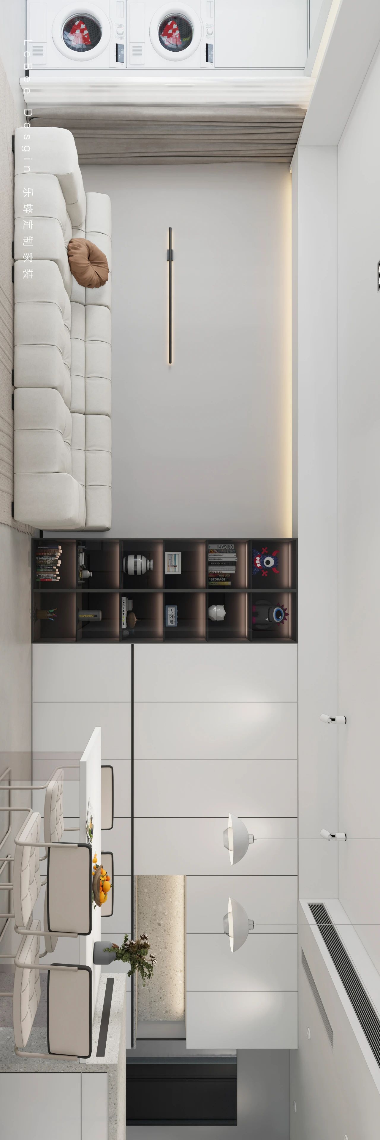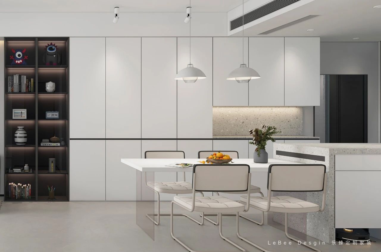 進(jìn)門就是餐廚空間,先靠右手邊做收納柜,滿足入戶置物需求。定制餐島一體+簡約吊頂,餐桌以簡為主,高品質(zhì)生活從軟裝就能看得出,入戶門左側(cè)布置一門到頂?shù)膽铱帐占{柜+黑棕色展示柜,一整個高級感拉滿!