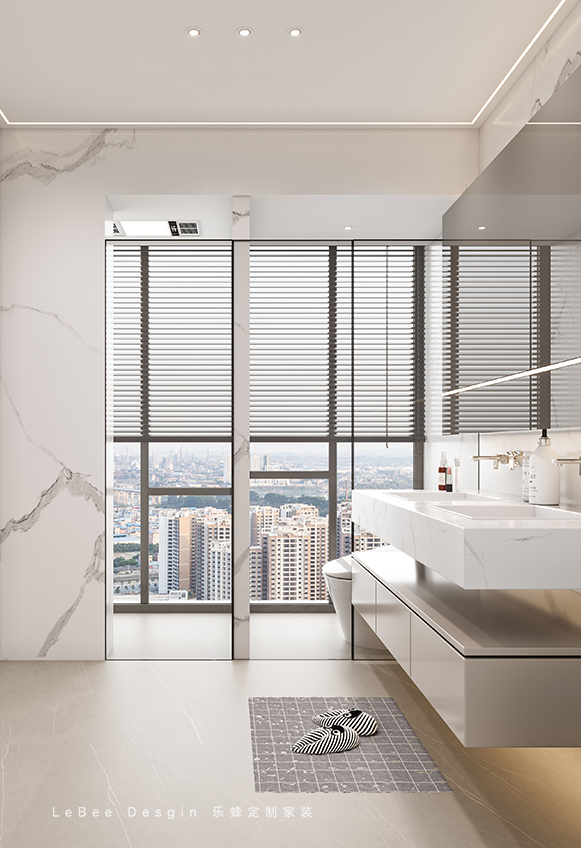 墻面可以使用柔和細膩的米白色乳膠漆,營造溫馨感。地面可以選擇灰色或米色的大理石瓷磚,讓空間顯得通透大氣。