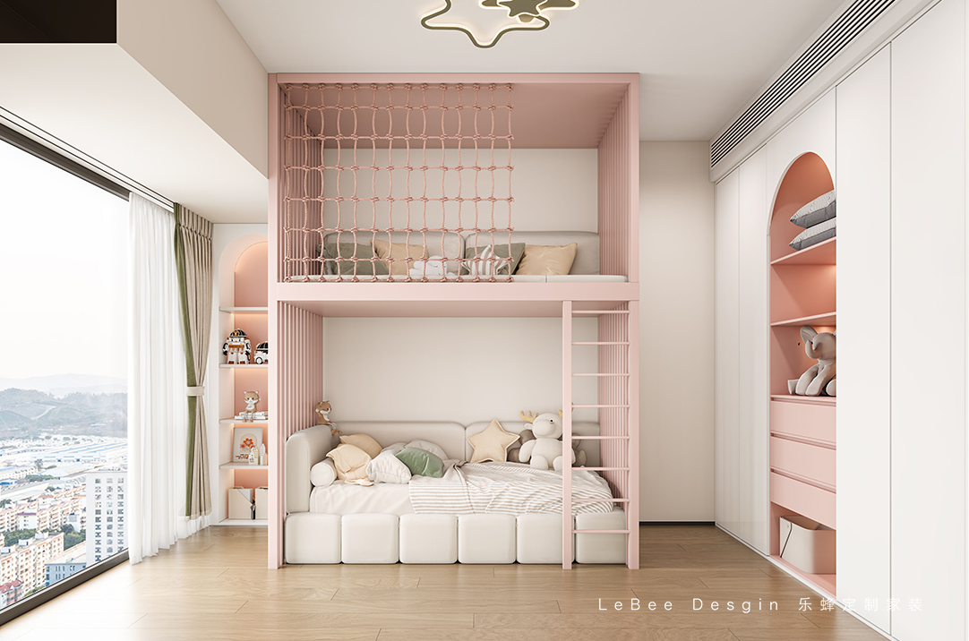 女孩房以粉色和奶白色作為延伸,營造舒緩而不甜膩的少女感,地板沿用客廳整體風格,選擇淺色木地板,整體更加溫馨舒適。