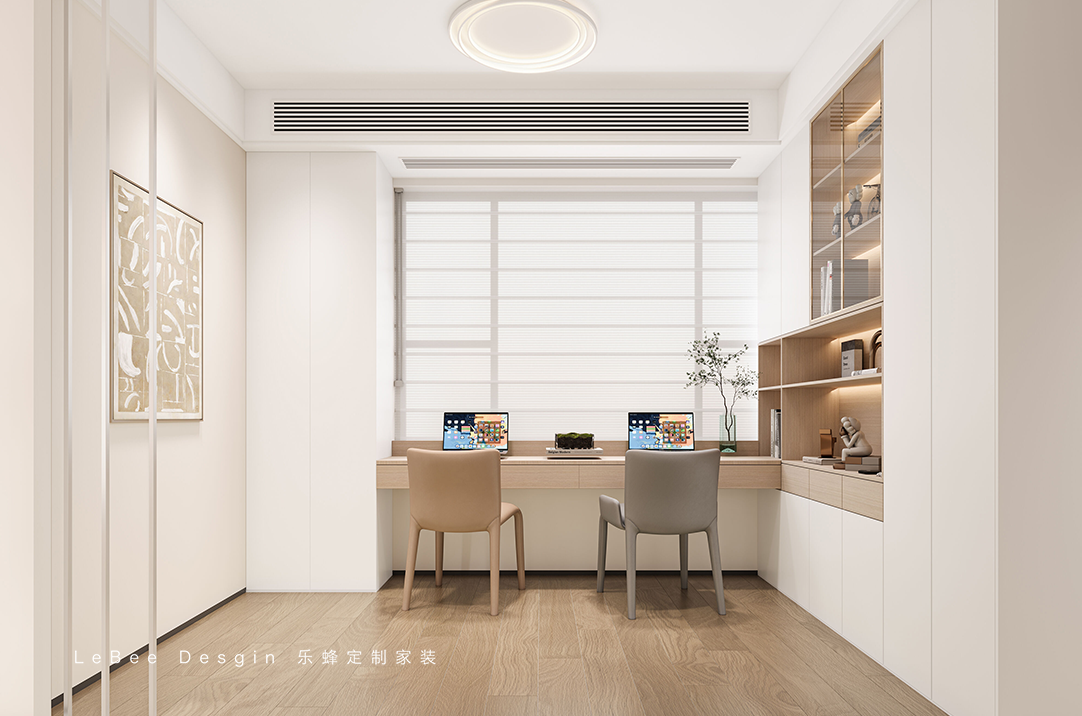 多功能房整體以白色為主,再加上原木色為點綴,高級又溫馨還不顯雜亂 原木色的桌面和開放格也相對更耐臟。