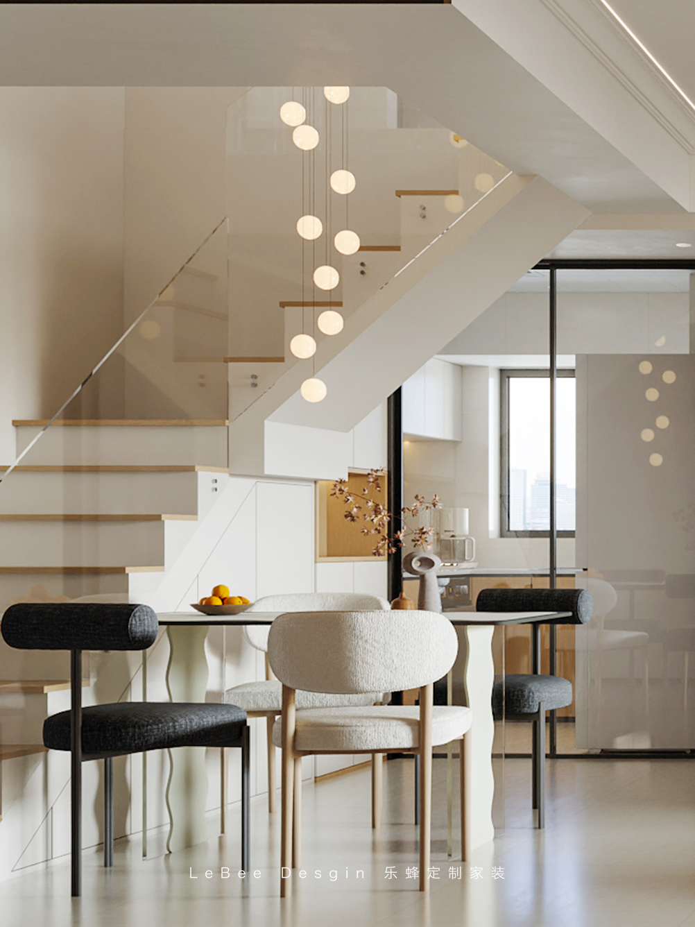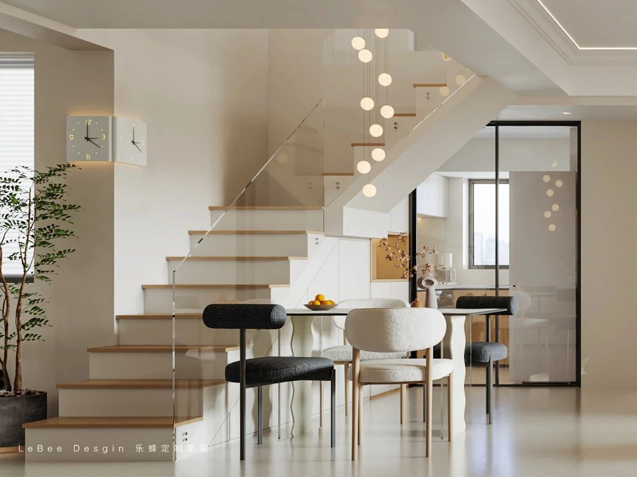 餐廳利用樓梯挑空空間,設懸浮吊燈,配玻璃餐桌和皮質座椅,轉角時鐘點綴,獨具巧思。