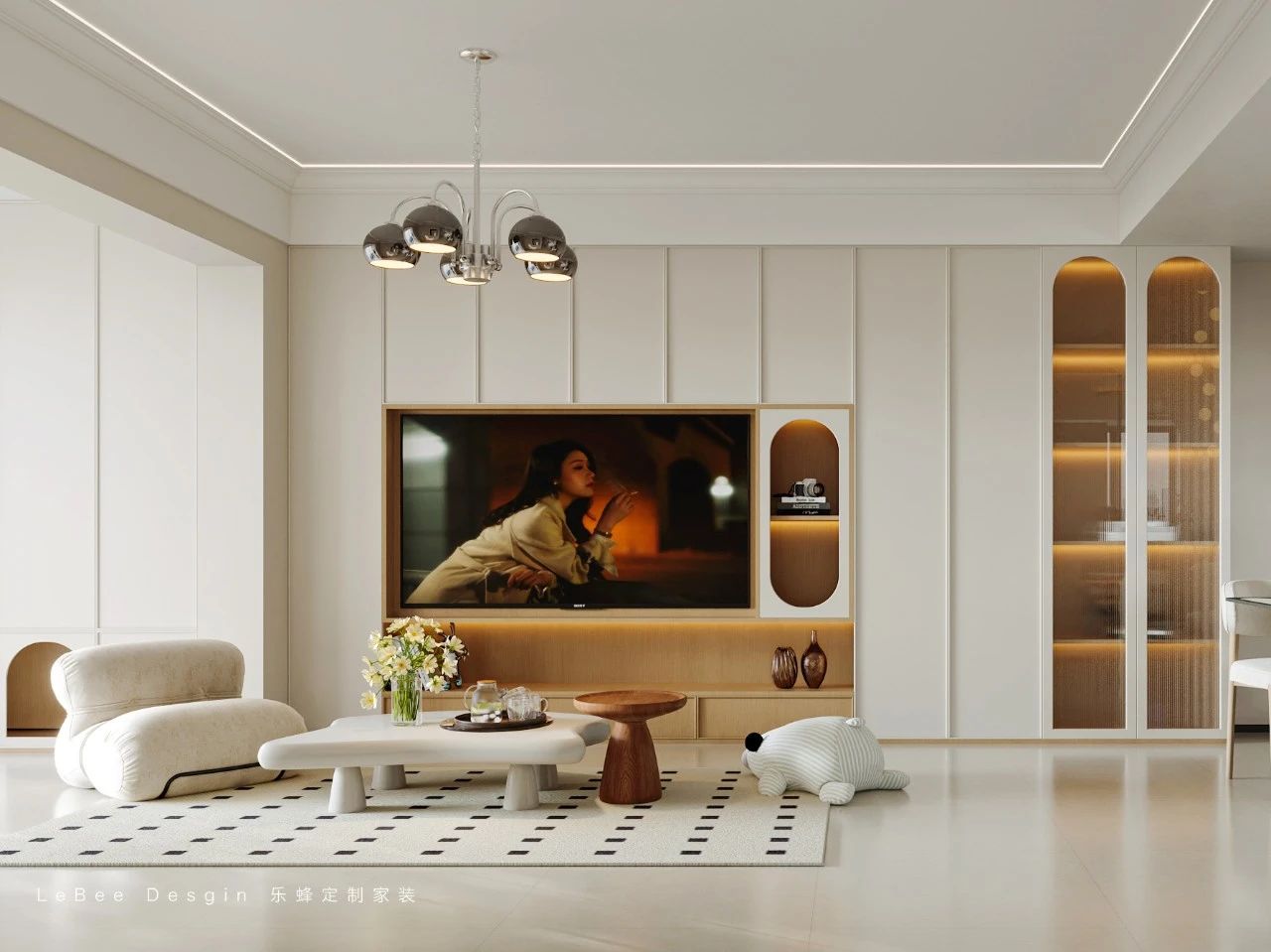 電視墻采用一門到頂的設計,打造簡潔大氣的外觀,同時增加收納空間,且無衛生死角。