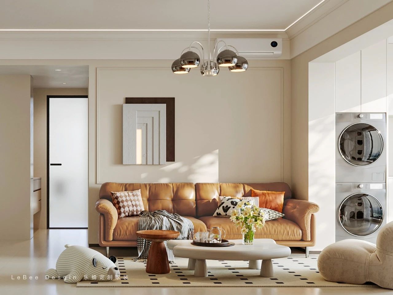 沙發背景墻則選用柔和的奶油色藝術漆,奠定溫馨的基調,石膏線進行裝飾,勾勒出精致的邊框,搭配柔軟的抱枕、地毯和窗簾,材質以棉麻、絨面為主,增加溫馨感。