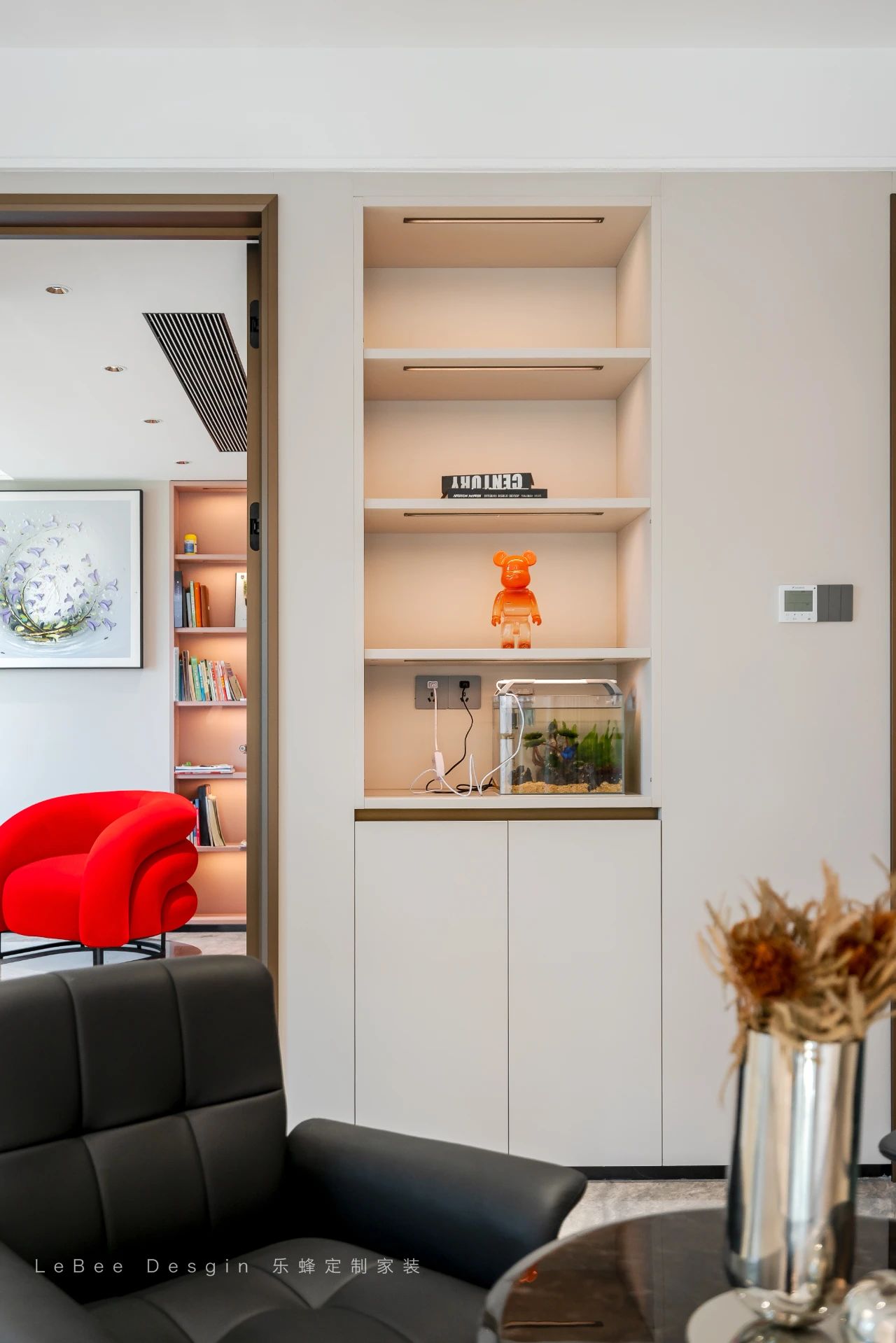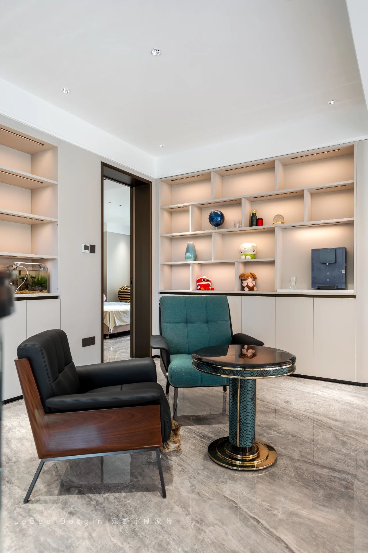 側(cè)邊設(shè)置組合式的書架和衣柜,擺放上各類書籍和模型方便長(zhǎng)輩閱讀。