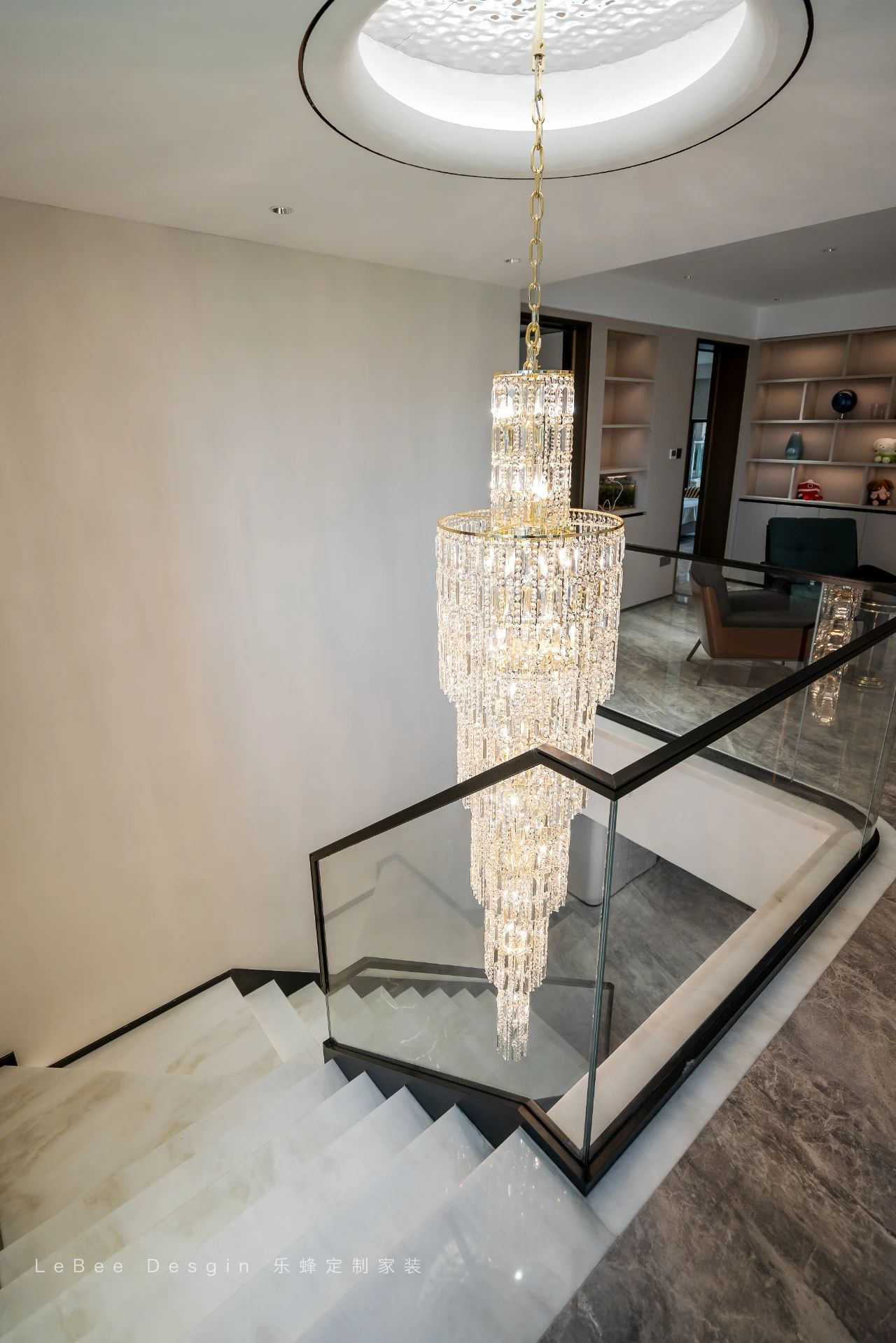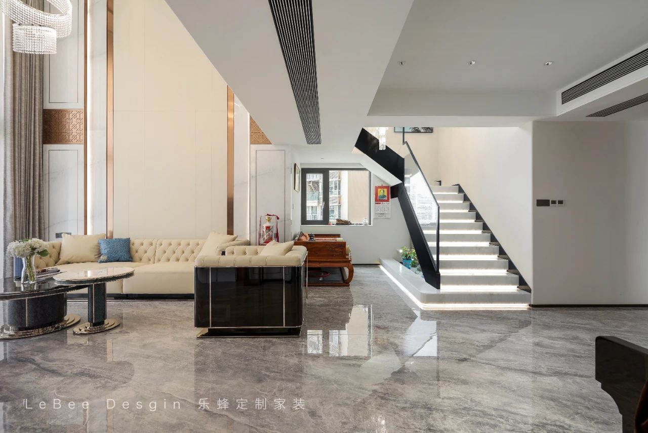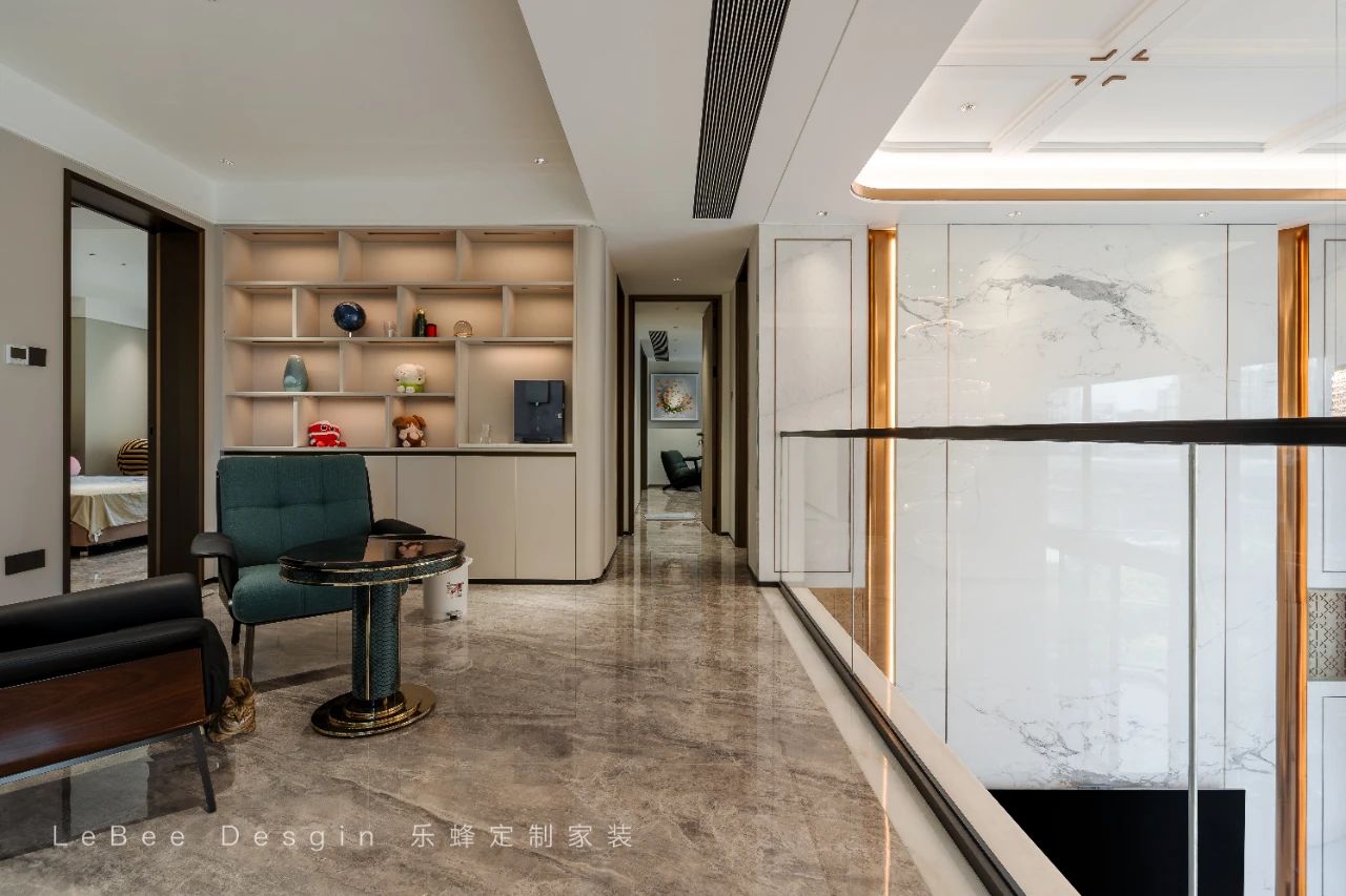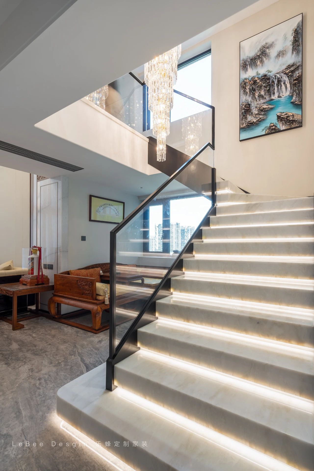 樓梯間通鋪與客餐廳一致的大理石,淺色系的低調(diào)質(zhì)感,搭配連貫地臺(tái)的設(shè)計(jì),有效地延伸了空間視覺(jué),讓每一步都仿佛走在藝術(shù)的長(zhǎng)廊。