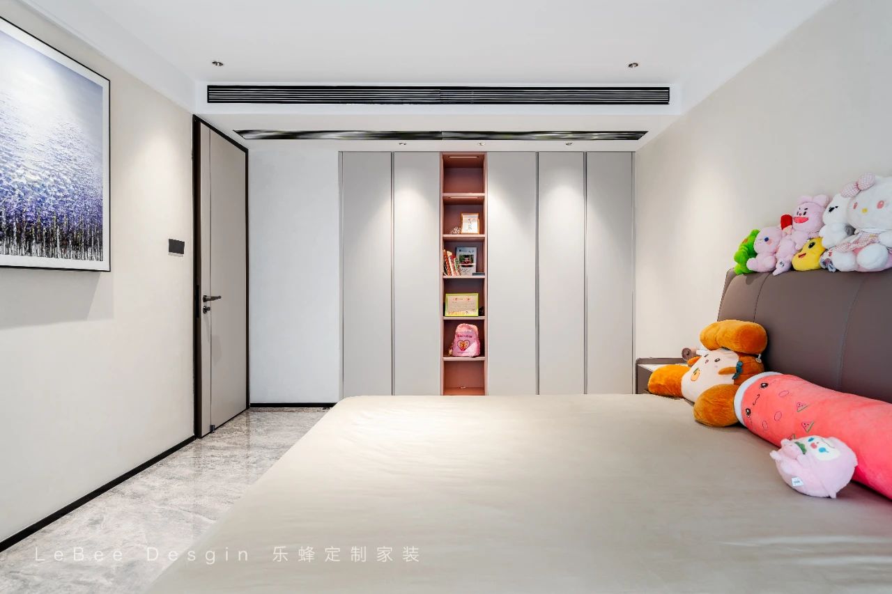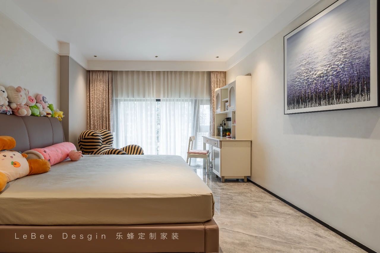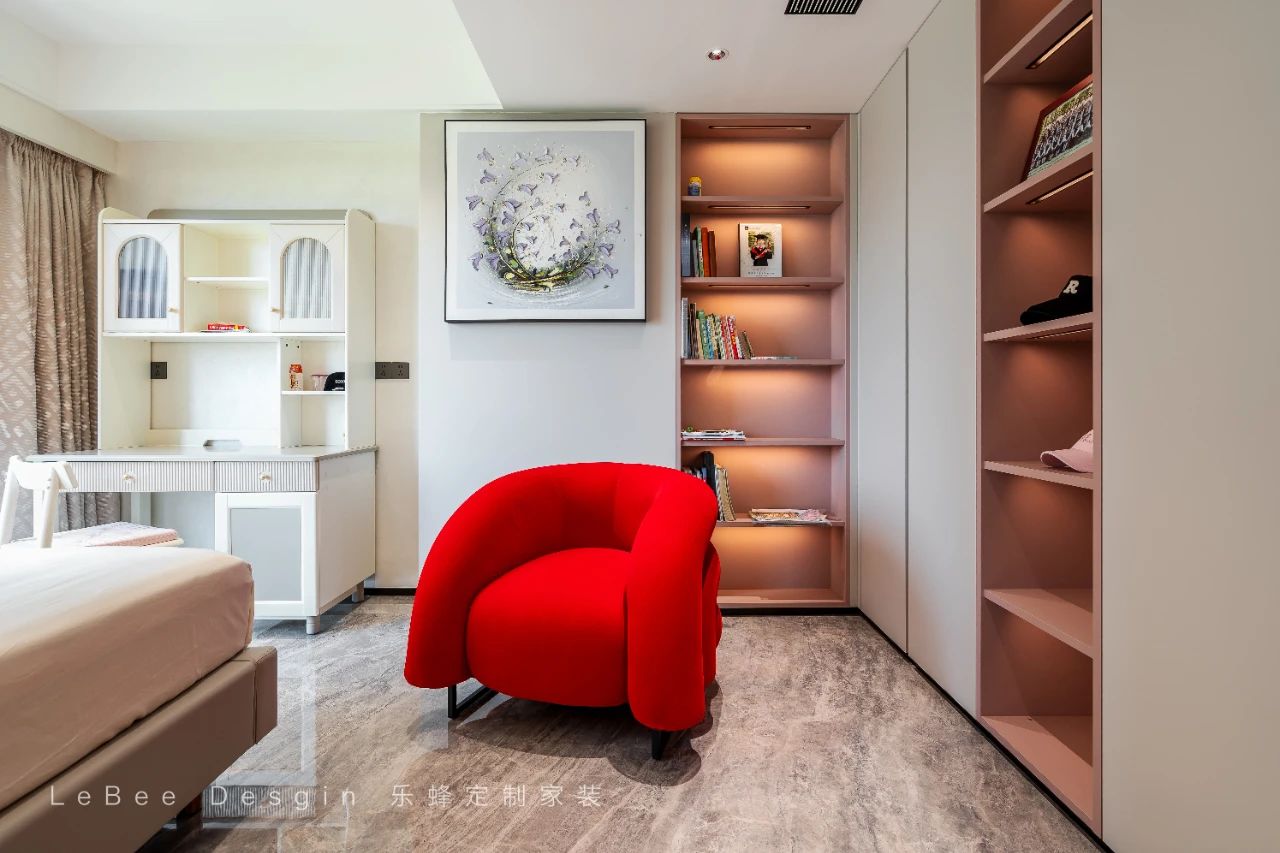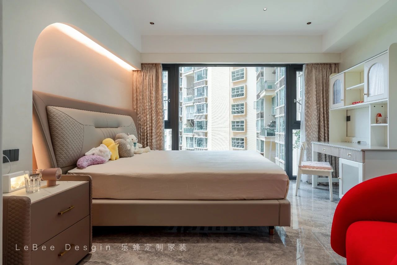床尾采用弧形過(guò)渡的柔光燈設(shè)計(jì),增添了一份溫柔與浪漫。一旁放置精致的梳妝臺(tái),滿足小公主愛(ài)美的小心思。