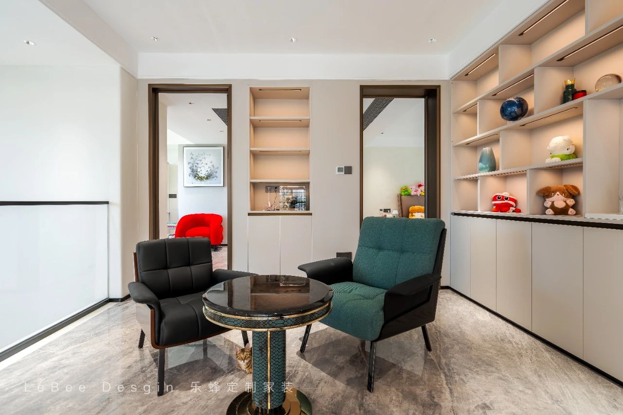 二樓的休閑區(qū)是家人休閑娛樂(lè)的好去處。舒適的布藝沙發(fā)圍繞著一張圓形茶幾,柔軟的靠墊讓人可以隨意倚靠。