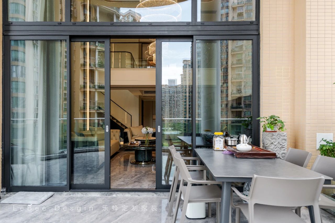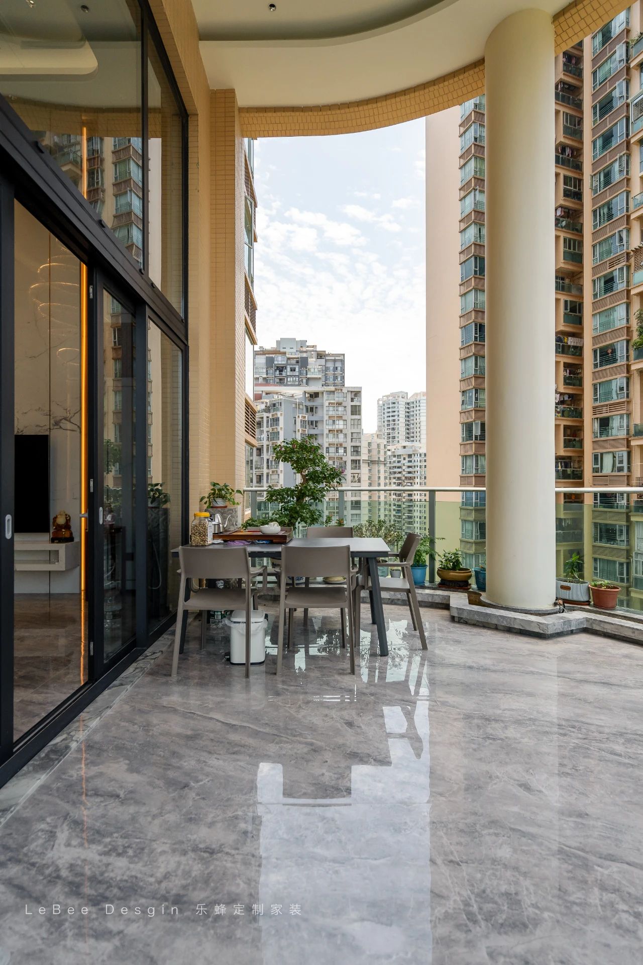 陽(yáng)臺(tái)開(kāi)放式設(shè)計(jì),視野開(kāi)闊。地面鋪設(shè)灰色大理石瓷磚,黑色的茶幾,一側(cè)放置業(yè)主喜愛(ài)的綠植,增加自然氣息。