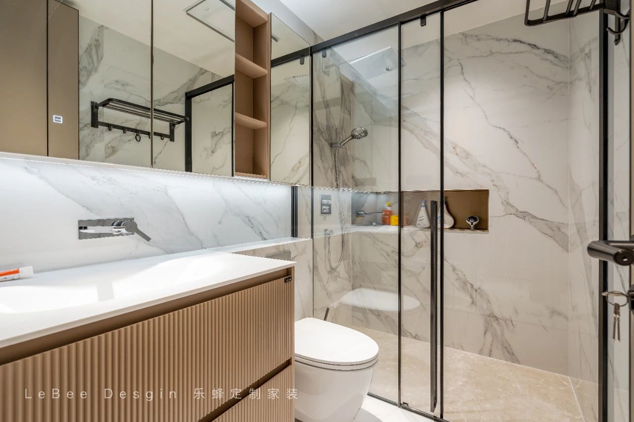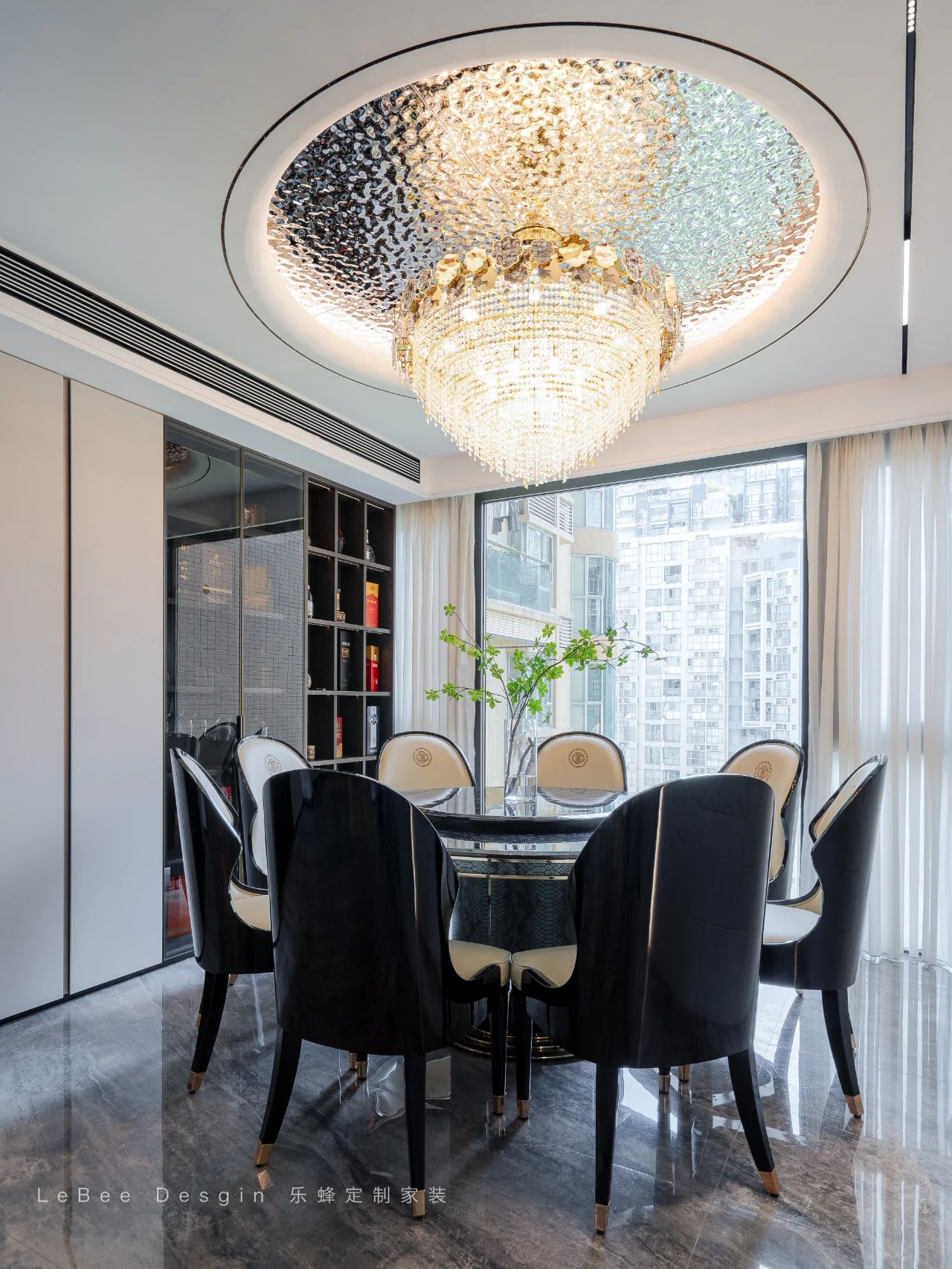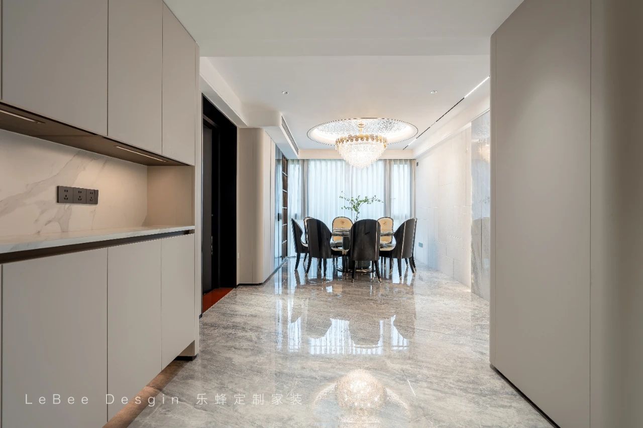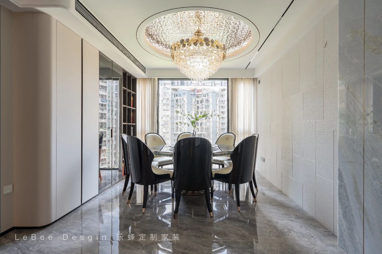 餐廳延續(xù)了整體的輕奢風(fēng)格,一張優(yōu)雅的大理石餐桌搭配精致的皮質(zhì)餐椅,營(yíng)造出舒適而高雅的用餐氛圍。頂部的華麗吊燈灑下柔和的光線,讓每一次用餐都充滿儀式感。
