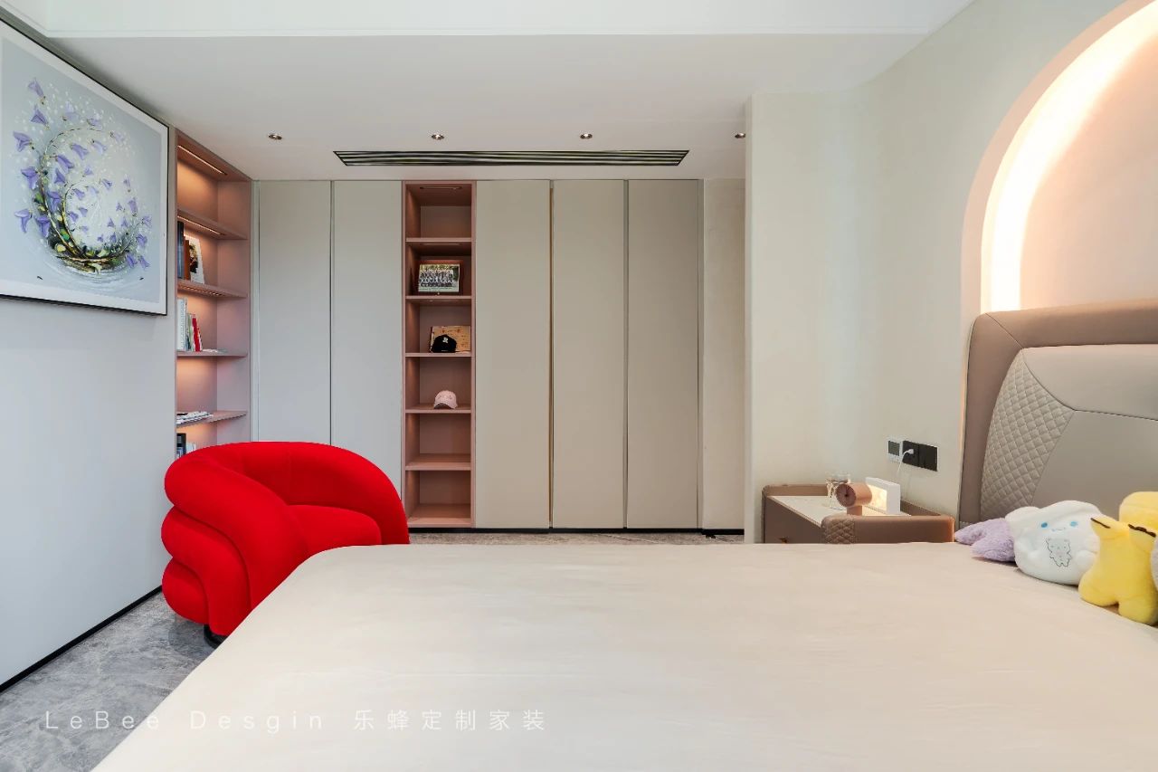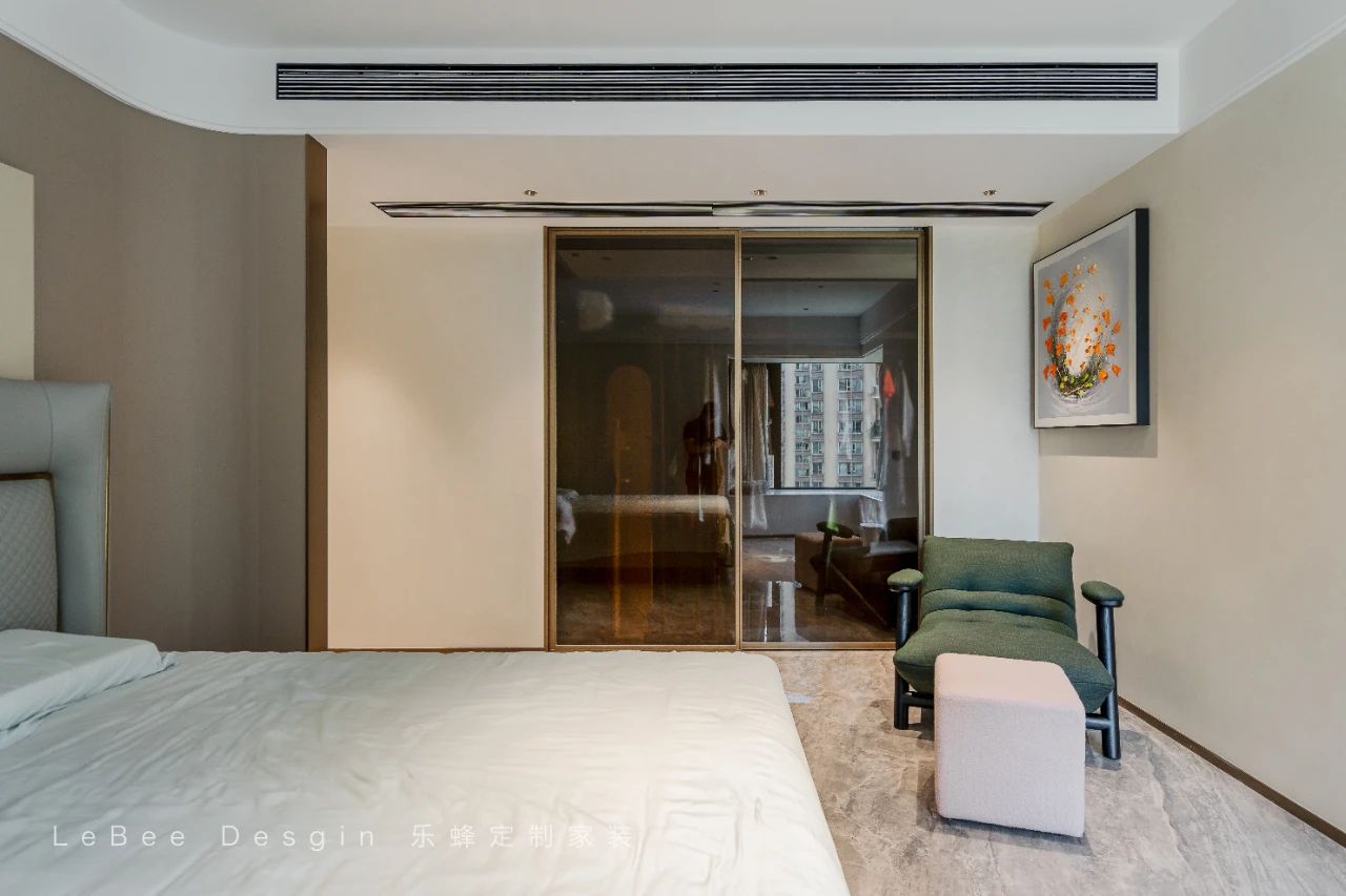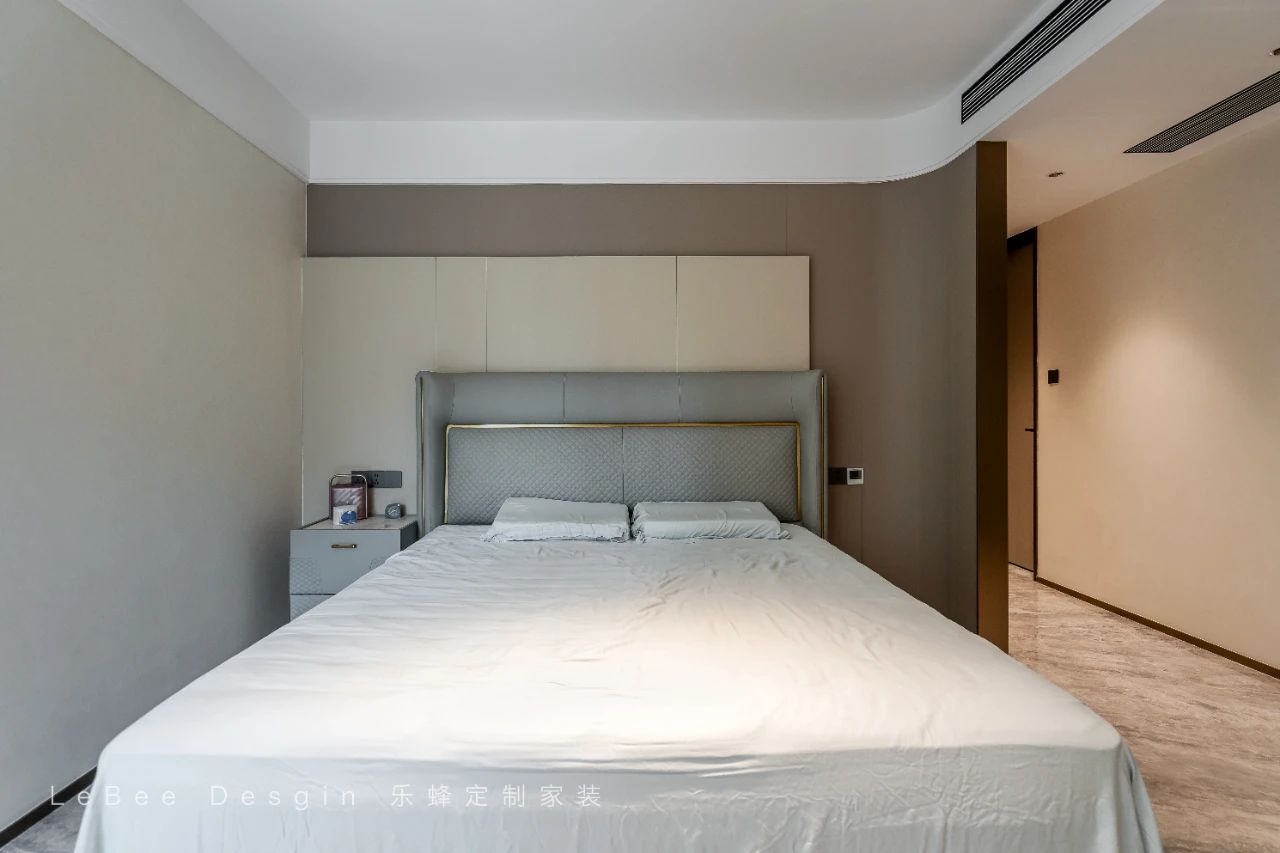 奢風(fēng)的主臥設(shè)計(jì)中,巧妙地運(yùn)用了木飾面背景墻的拼色設(shè)計(jì),并且通過(guò)弧形元素進(jìn)行自然而流暢的過(guò)渡,從而營(yíng)造出一種獨(dú)特且極具優(yōu)雅魅力的視覺(jué)效果。