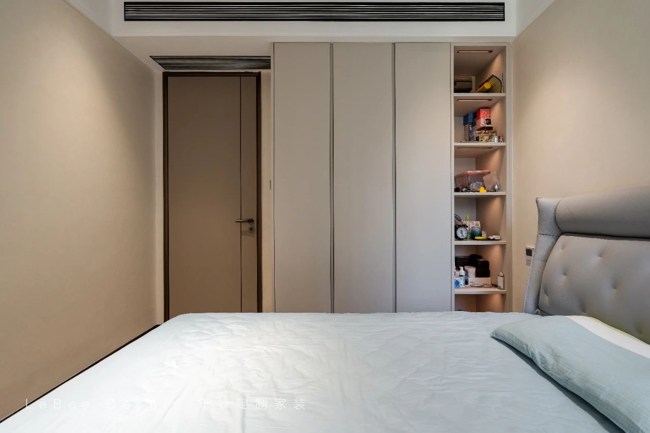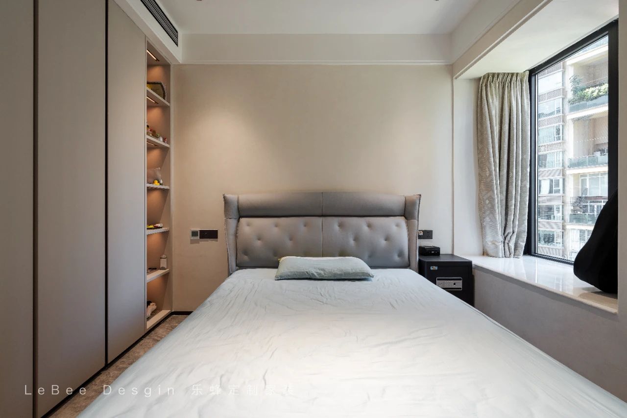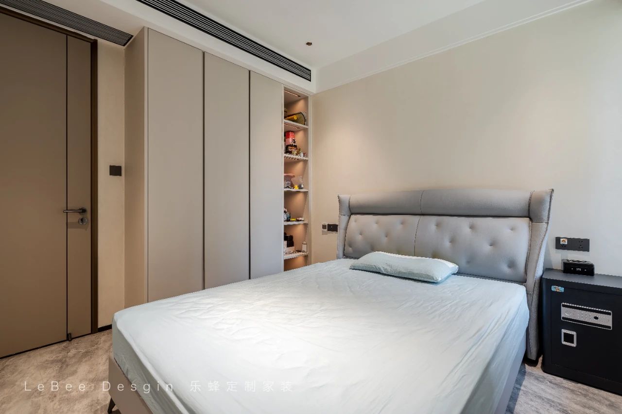 奢風(fēng)的主臥設(shè)計(jì)中,巧妙地運(yùn)用了木飾面背景墻的拼色設(shè)計(jì),并且通過(guò)弧形元素進(jìn)行自然而流暢的過(guò)渡,從而營(yíng)造出一種獨(dú)特且極具優(yōu)雅魅力的視覺(jué)效果。