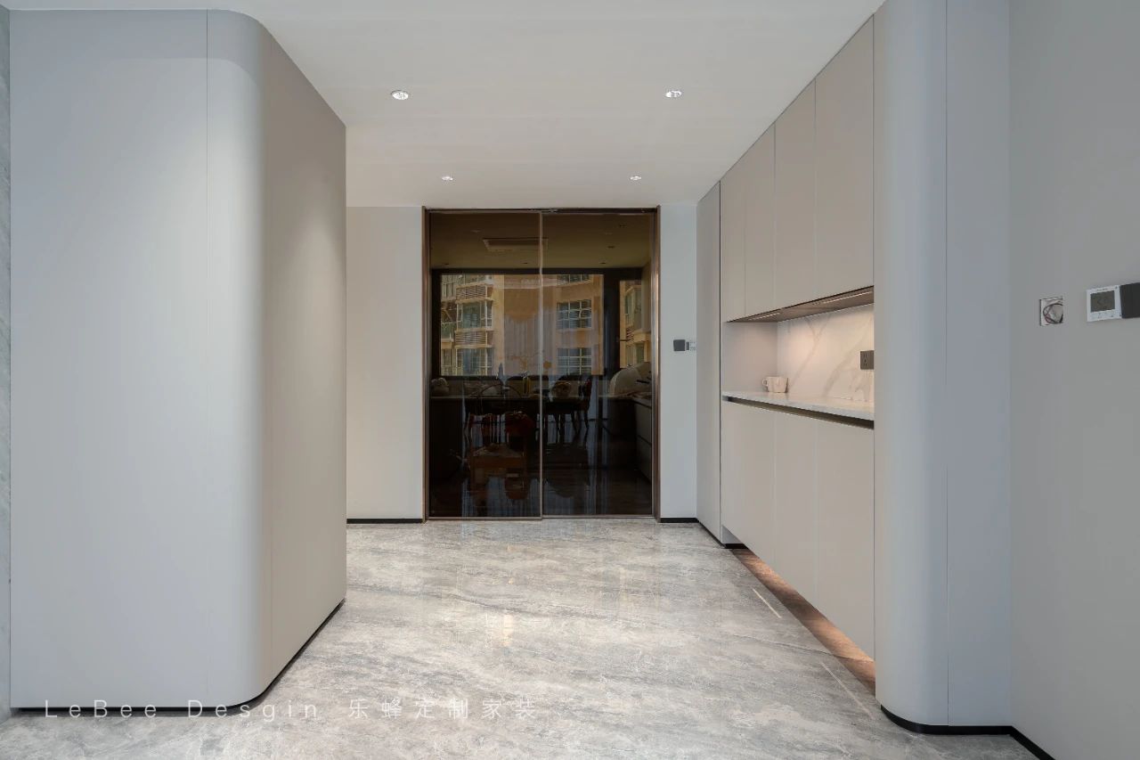 玄關(guān)宛如一幅徐徐展開(kāi)的畫卷。地面采用獨(dú)特紋理的大理石瓷磚,弧形過(guò)渡相互呼應(yīng),營(yíng)造出高雅的氛圍。