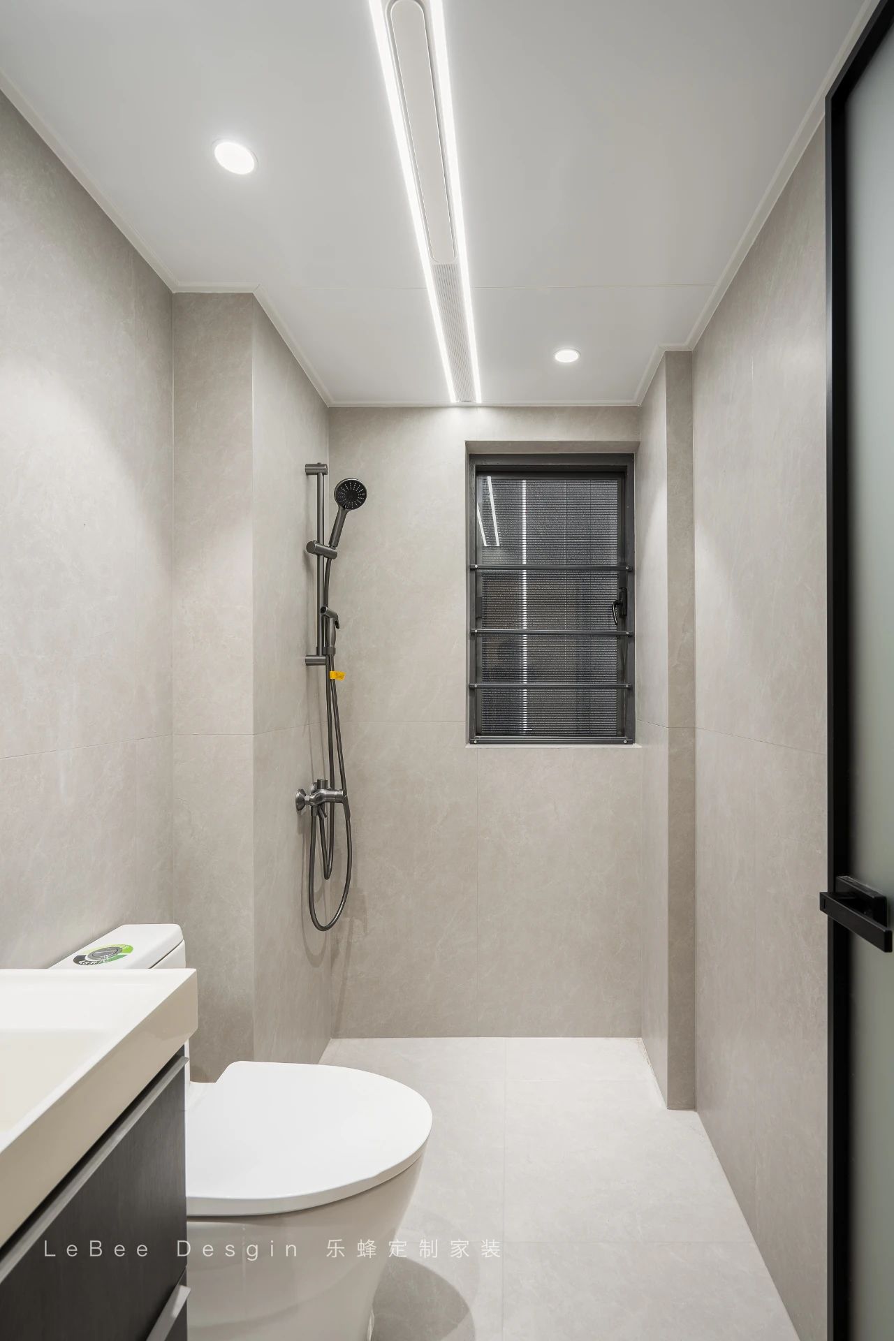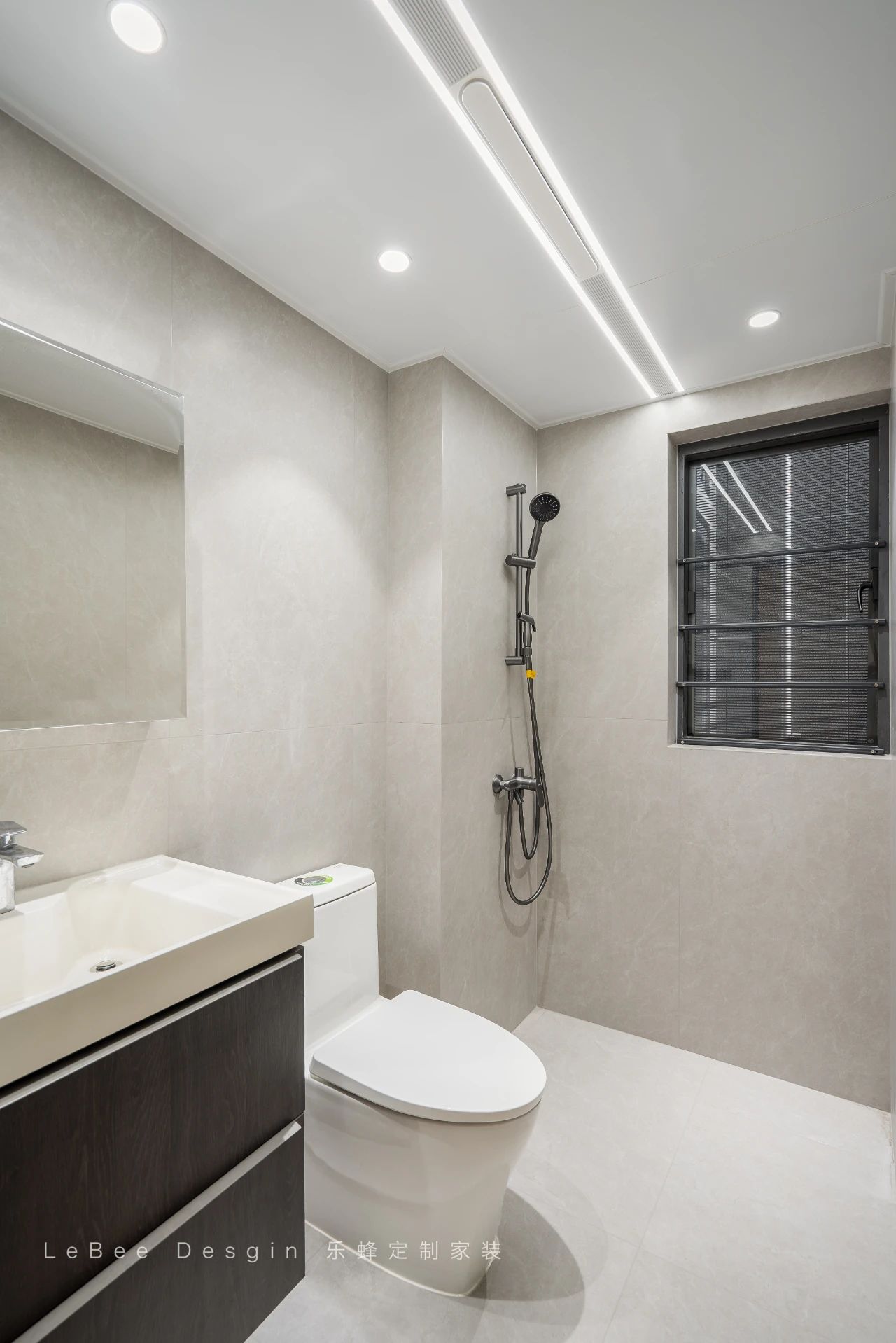 公衛(wèi)干濕分離設(shè)計,通透鏡柜讓局限的衛(wèi)生間,深藍(lán)色收納柜讓這個空間更加實(shí)用。