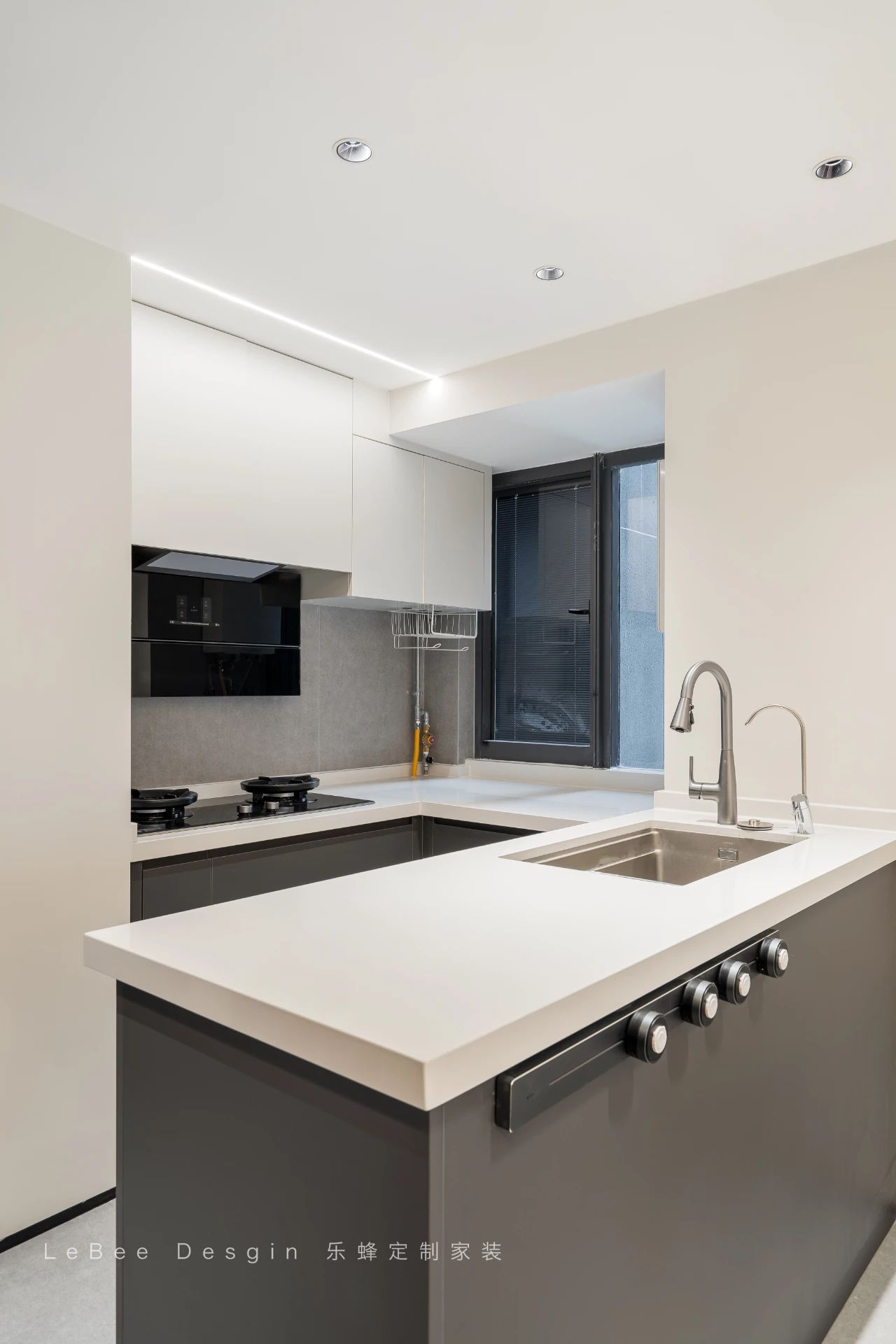純白餐廚空間搭配深藍(lán)色柜體,讓整體空間更明亮。餐廚一體的設(shè)計,開放式廚房讓餐廚空間秒大一倍。