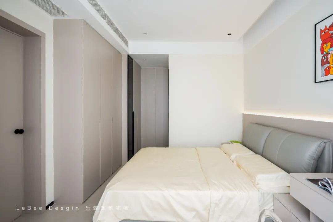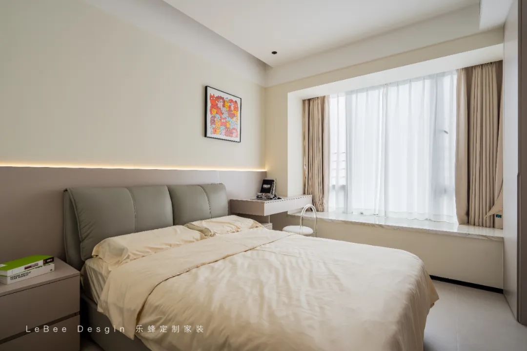 主臥墻面整體涂刷低飽和度淺色系乳膠漆,柔和色調營造靜謐氛圍,同時與室外綠植景觀形成自然呼應。
