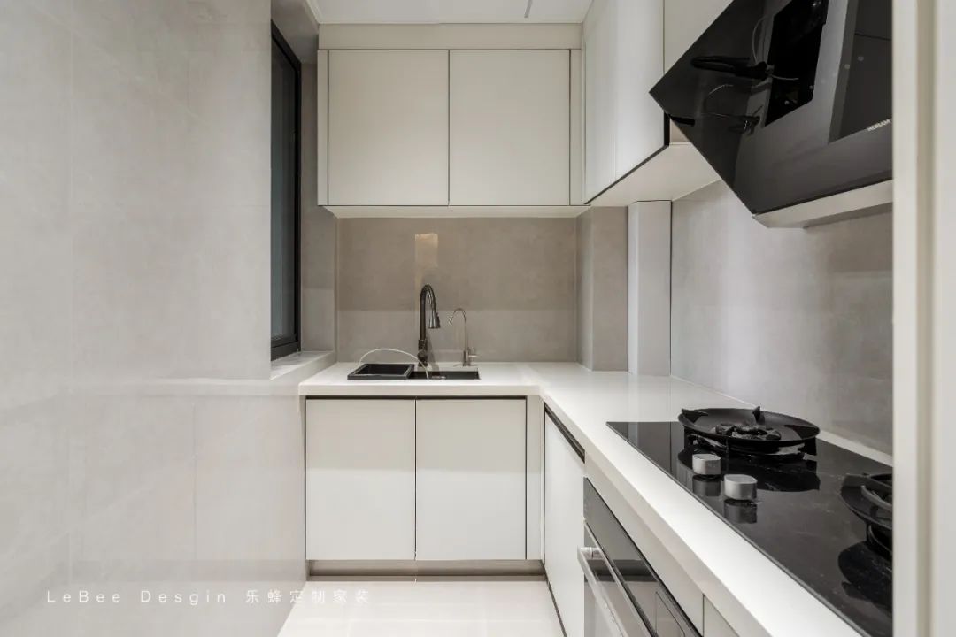 吊柜下方后期可增設感應燈帶,石英石臺面無縫拼接,墻面采用琺瑯板易清潔。