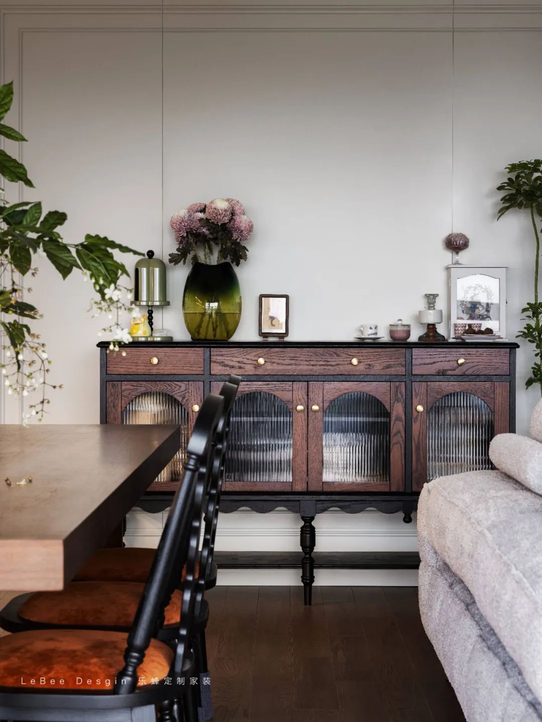 餐邊柜小心機:左側:雙層玻璃酒柜+復古黃銅把手,藏酒展示兩不誤;