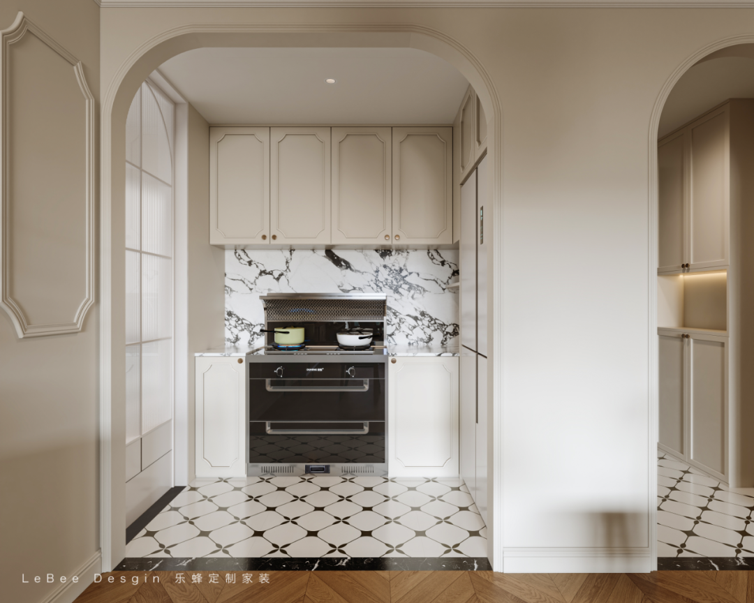 打破封閉式格局,復古UP線條墻面與胡桃木色櫥柜相映成趣。延伸出水吧臺,搭配高腳藤編椅,咖啡香氣與晨光在此交融。