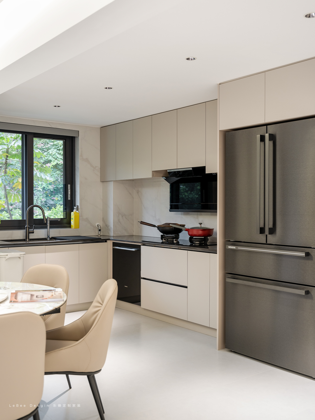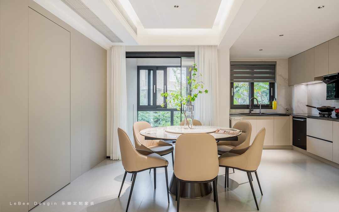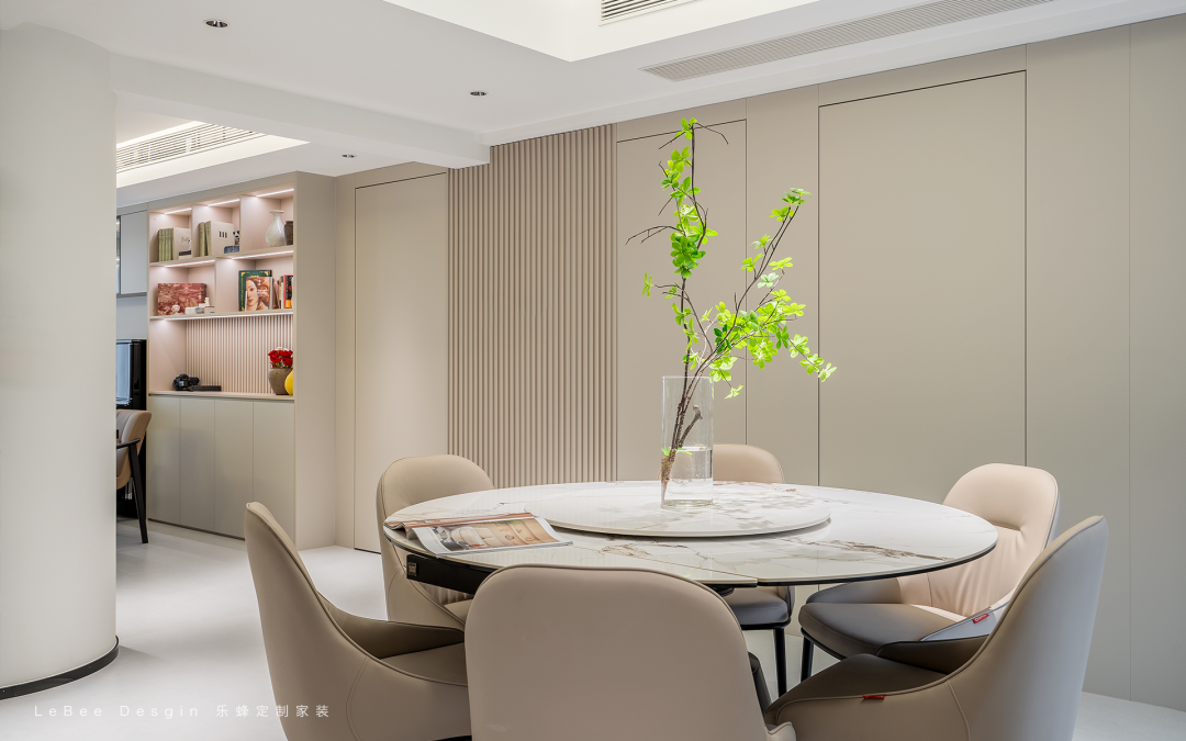 餐桌和餐椅選擇與整體色調相協調的奶油白色,搭配精致的餐具和柔和的燈光,使用餐體驗更加愉悅。