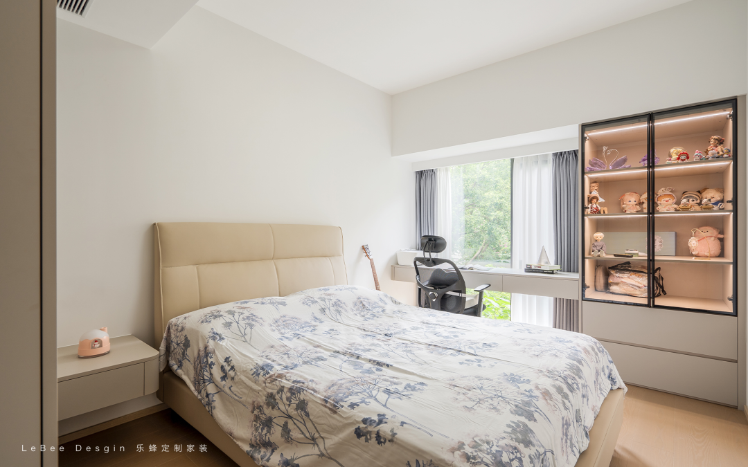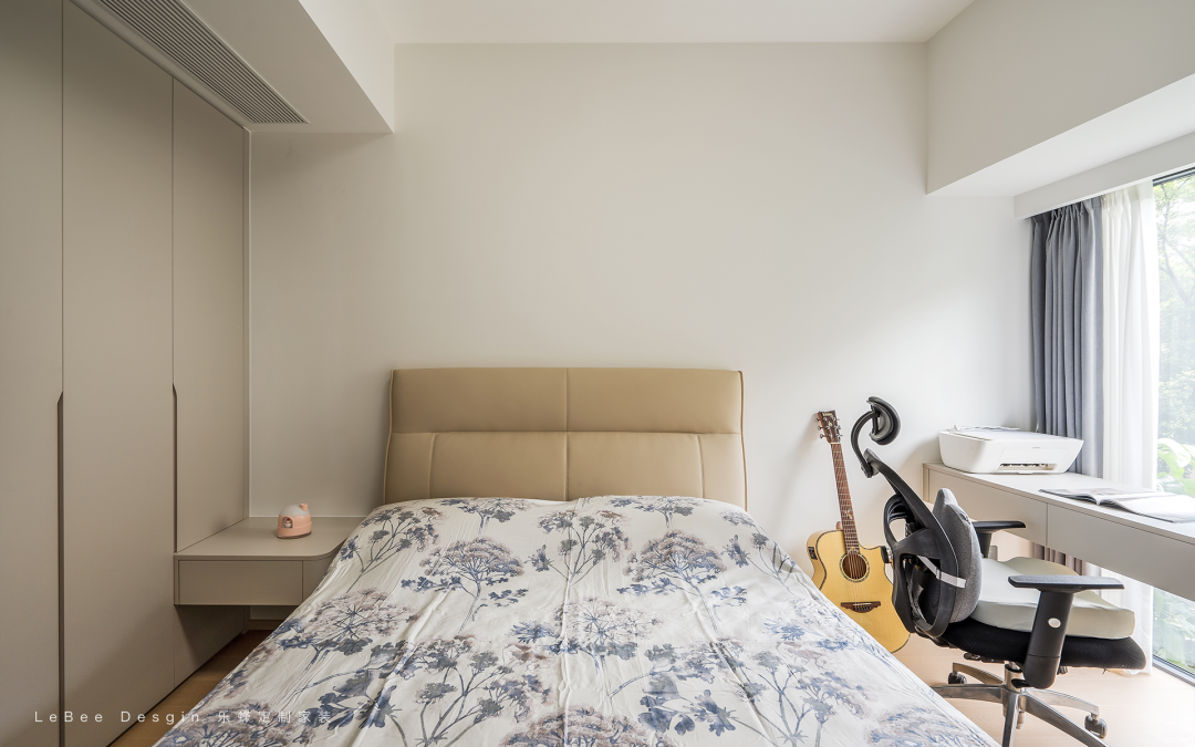 主臥延續了簡約的風格,卡其色皮床以其獨特的質感,營造出低調而高級的睡眠環境。在陽臺窗前設計懸浮書桌,空間利用率高。