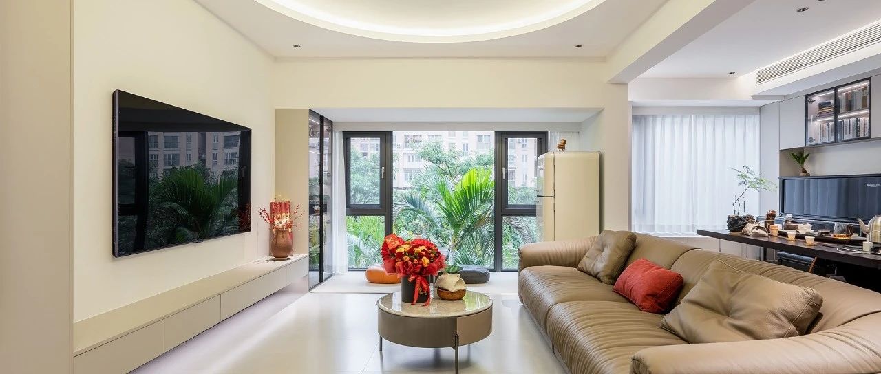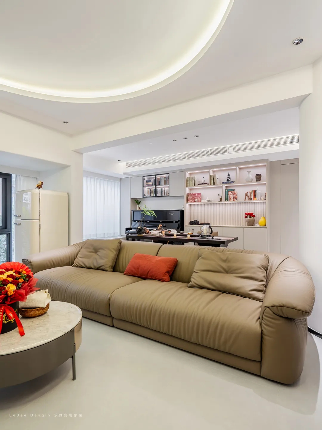 客廳采用開放式布局,墻面、頂面和地面均采用奶油白色調,使整個空間明亮而寬敞~