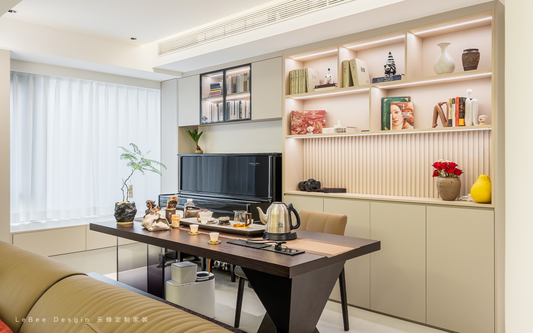 將茶室設計在沙發后,有效的利用每一寸空間,整面墻做開放格設計,既能放置書籍、茶具、藝術擺件等