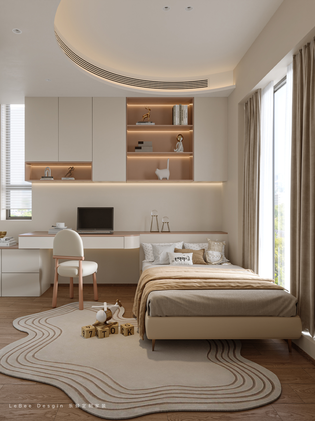 臥室中的色彩搭配和諧而舒緩,弧形吊頂的設計,為這個空間增添了注入了靈動的層次感。