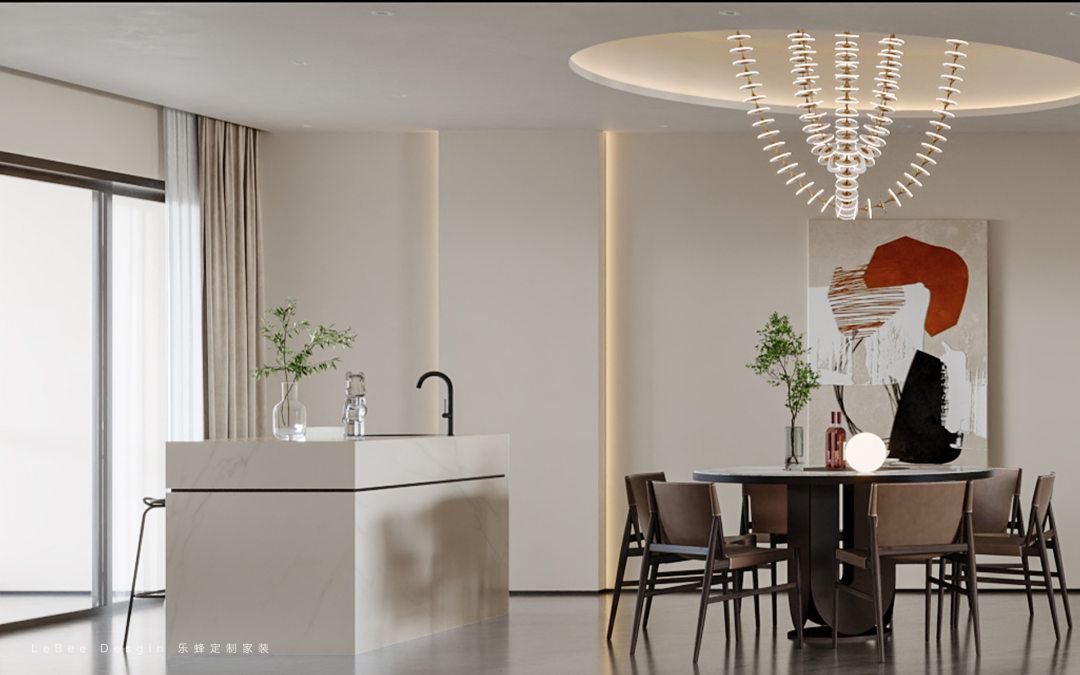 客餐廳一體設計,餐廳采用簡單低調的設計,設置白色和胡桃木色的上下餐邊柜,滿足收納需求。